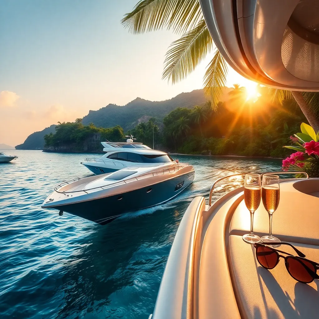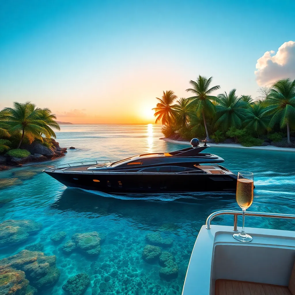 Imagine a serene, tropical island getaway. A sleek, black yacht glides across the crystal-clear waters, surrounded by lush green palms and vibrant coral reefs. A champagne toast awaits on the deck, as the sun sets behind the horizon. Create a captivating AI image that embodies the epitome of luxury and relaxation.