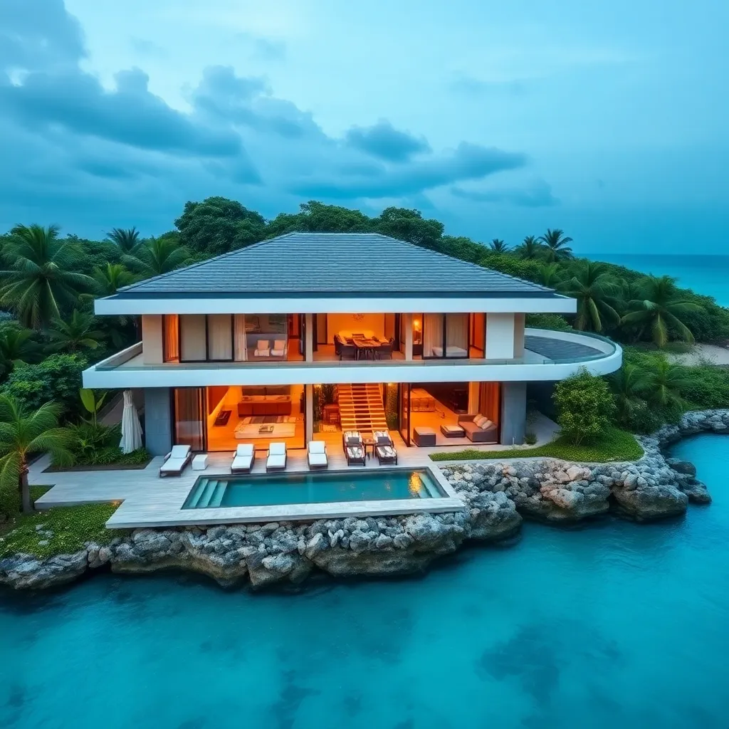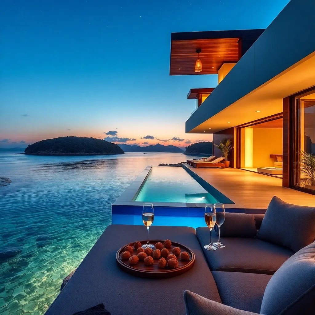 Imagine a serene evening on a private island, surrounded by crystal-clear waters and lush greenery. A luxurious villa with sleek lines and polished wood accents stands majestically, its infinity pool glistening in the fading light. A champagne toast and canapés await on the plush balcony, as the stars begin to twinkle.