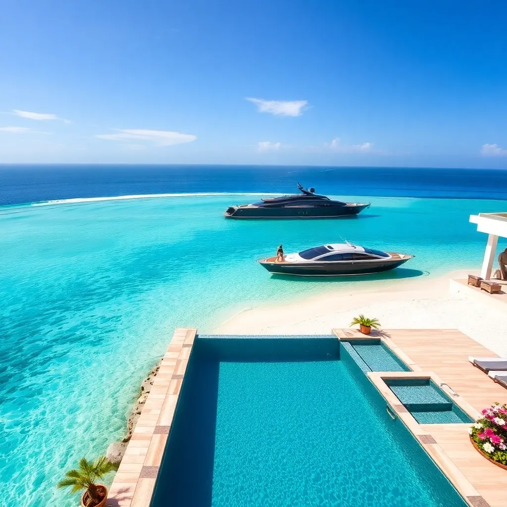 Imagine a lavish, sun-kissed beachside resort, where crystal-clear waters lap against pristine white sands. A sleek, black yacht glides effortlessly across the horizon, while a private, infinity-edge pool stretches towards the sea. The air is filled with the sweet scent of tropical flowers, and the sound of gentle waves.