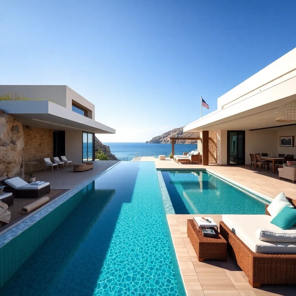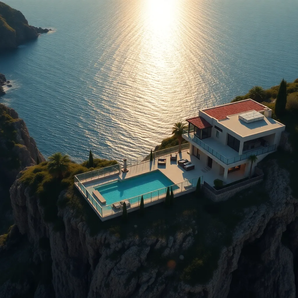 a private villa perched on a cliffside overlooking the sparkling Mediterranean Sea. The villa's sleek, modern design blends seamlessly with the lush greenery, featuring a infinity pool, outdoor kitchen, and lavish interior spaces. Generate an AI image that captures the essence of this luxurious retreat.
