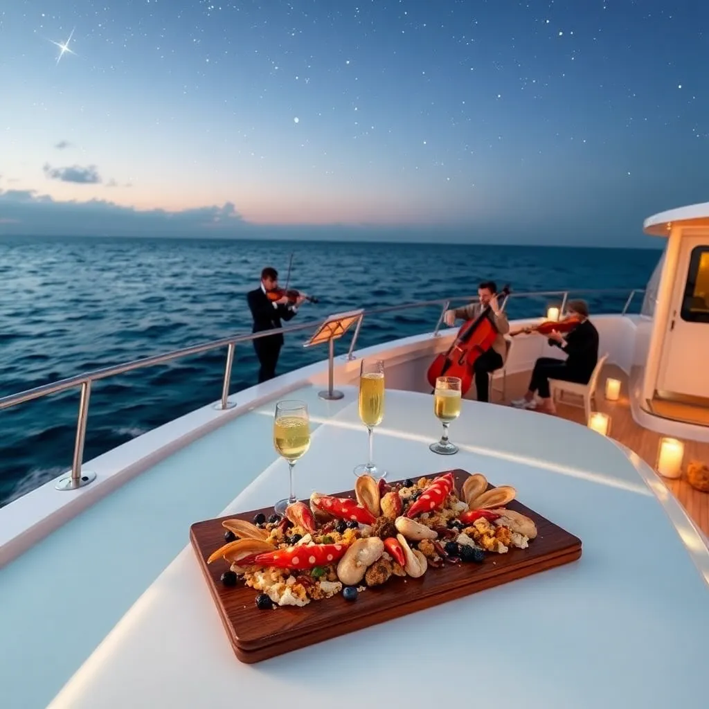 Imagine a serene evening on a private yacht, surrounded by crystal-clear waters and a starry sky. A champagne toast is being served on the deck, accompanied by a delectable seafood platter and a string quartet playing softly in the background. The luxurious atmosphere is enhanced by the warm glow of candles and the soft lapping of the waves against the hull.