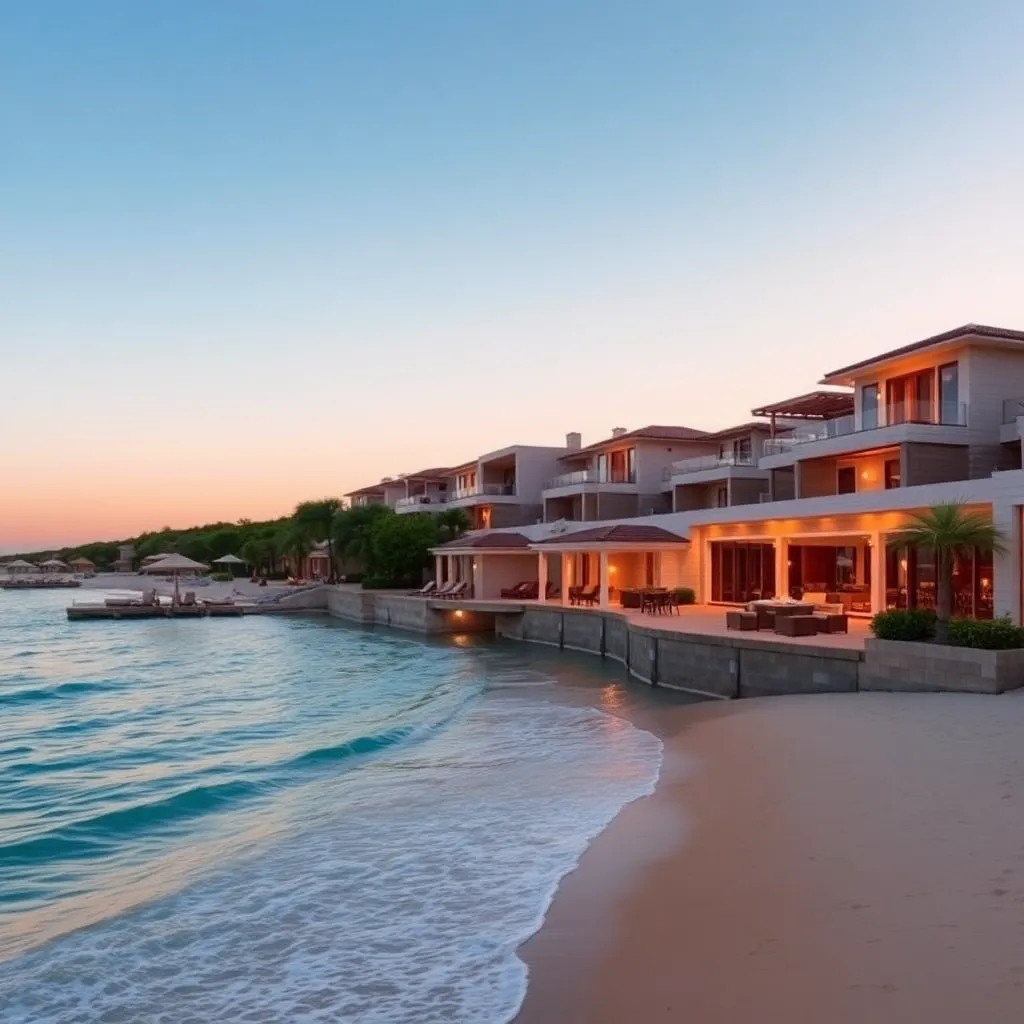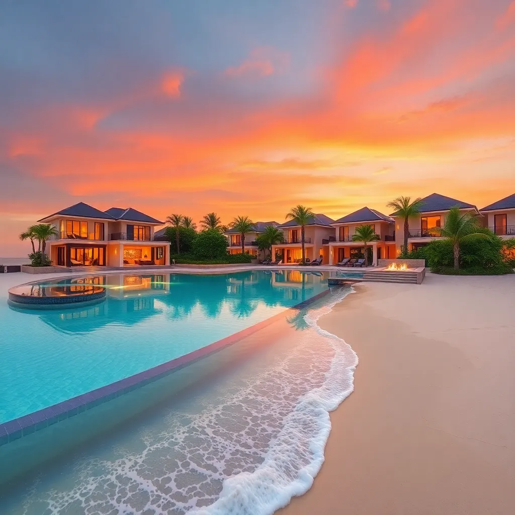 Imagine a serene and exclusive beachside retreat, where crystal-clear waters lap against the shore and lavish villas rise from the dunes. Capture the essence of this opulent getaway, featuring plush amenities, gourmet dining, and breathtaking views. Incorporate rich textures, warm lighting, and soothing colors to evoke a sense of ultimate relaxation.
