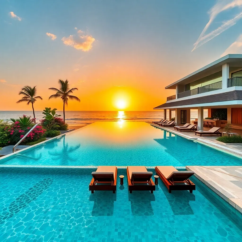 Imagine a serene beachside villa, surrounded by lush greenery and overlooking the turquoise ocean. The sun is setting, casting a warm golden glow. A private infinity pool stretches towards the sea, surrounded by comfortable lounge chairs and a stylish outdoor bar. A champagne bottle is chilling in an ice bucket, awaiting the perfect toast.