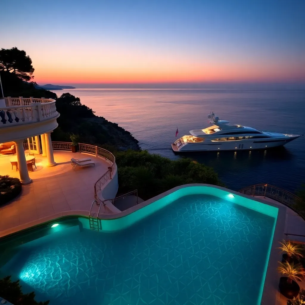 Imagine a serene evening at a luxurious villa overlooking the Mediterranean Sea. A private infinity pool glistens under the stars, surrounded by lush greenery and a private beach. A sleek, modern yacht docks in the distance, awaiting a sunset cruise. Capture the essence of opulence and tranquility in this idyllic setting.