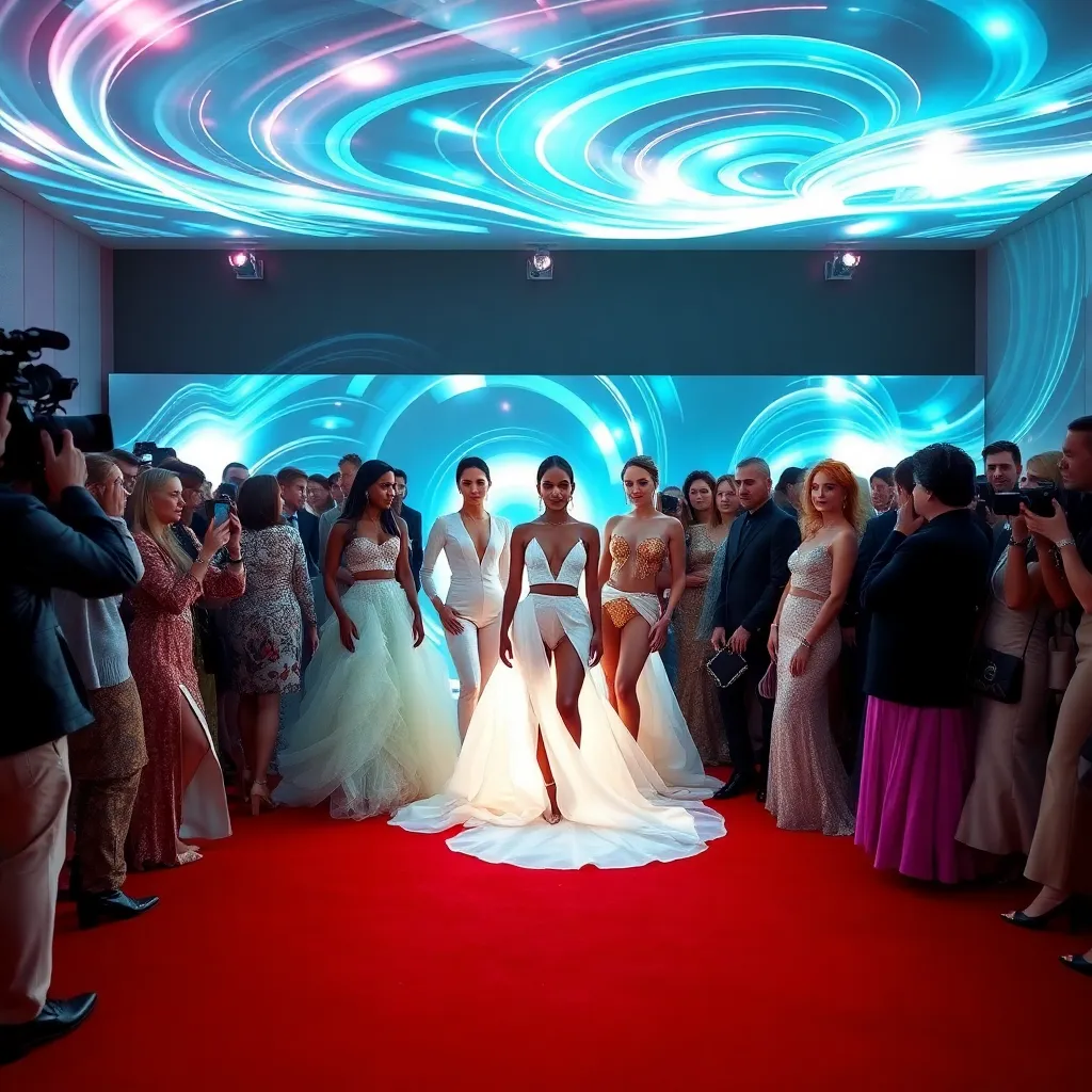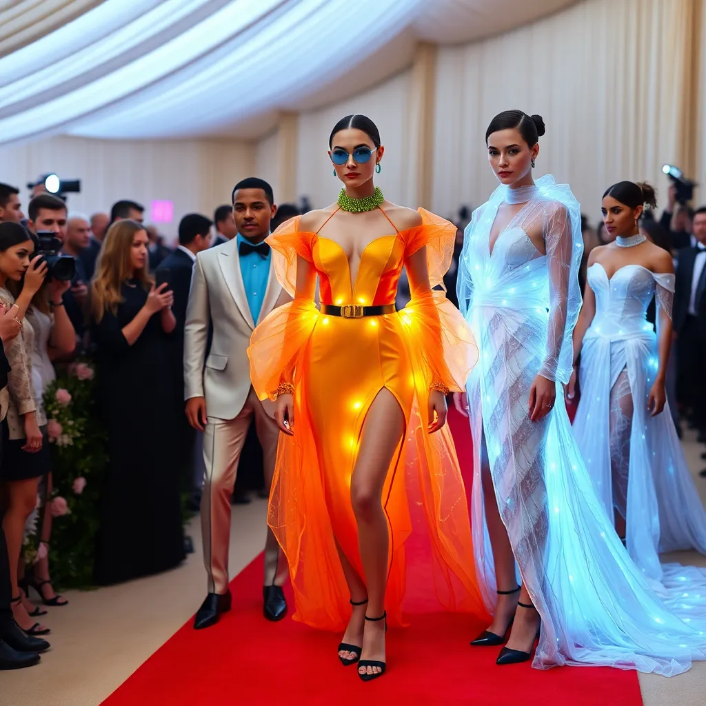 Imagine a futuristic Met Gala red carpet, where a striking ensemble of A-list celebrities, dressed in avant-garde outfits, pose amidst a backdrop of swirling LED lights and holographic projections. The atmosphere is electric, as paparazzi snap photos and social media influencers capture the moment. What does this scene look like?
