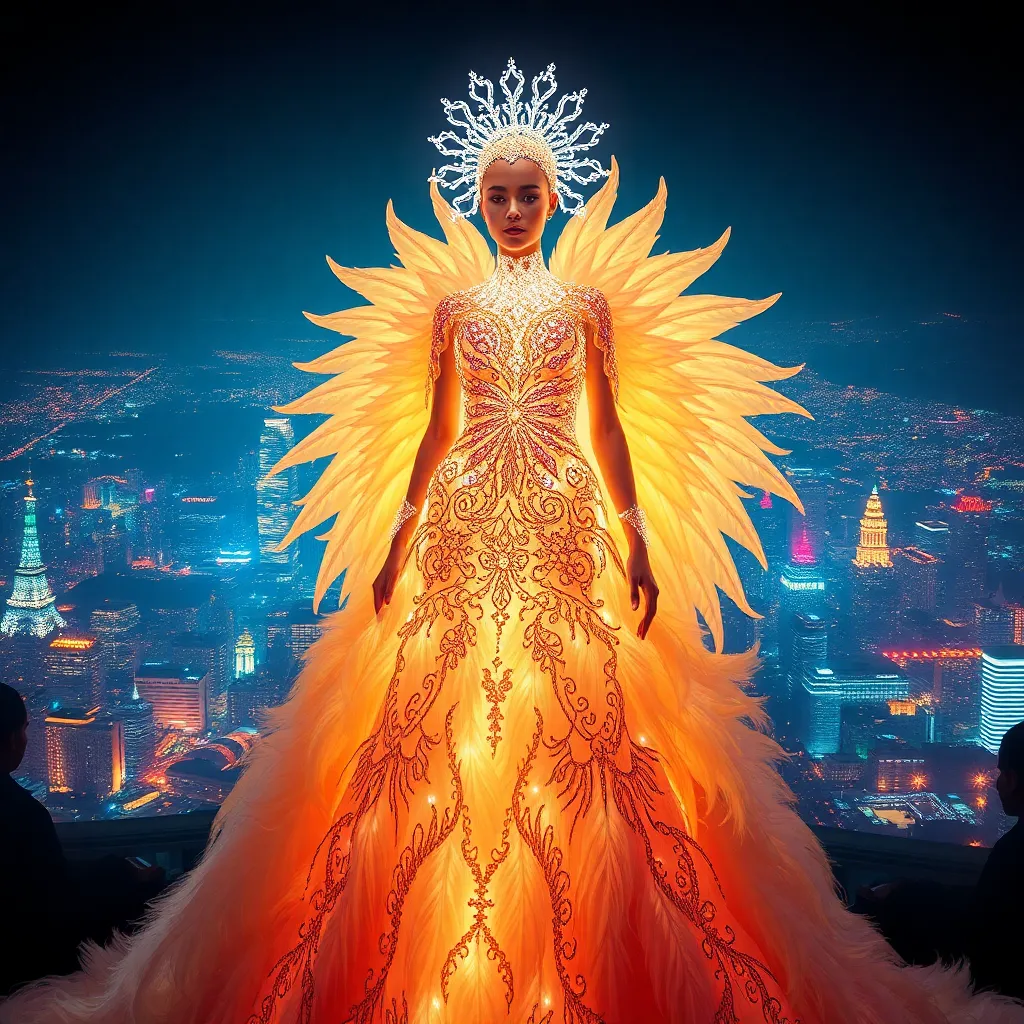Envision a futuristic Met Gala red carpet, where A-list celebrities gather to showcase their most daring, avant-garde, and eco-friendly fashion statements. The theme is 'Rebirth and Resilience.' Create an AI-generated image featuring a striking, haute-couture-clad model, surrounded by swirling lights, futuristic props, and a cityscape backdrop.