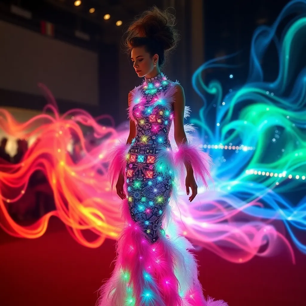 Imagine a futuristic Met Gala red carpet, where fashion meets technology. Design a gown that incorporates LED lights, iridescent fabrics, and 3D printed accessories. Create a striking visual representation of what the intersection of fashion, art, and innovation would look like on the most iconic night in fashion.