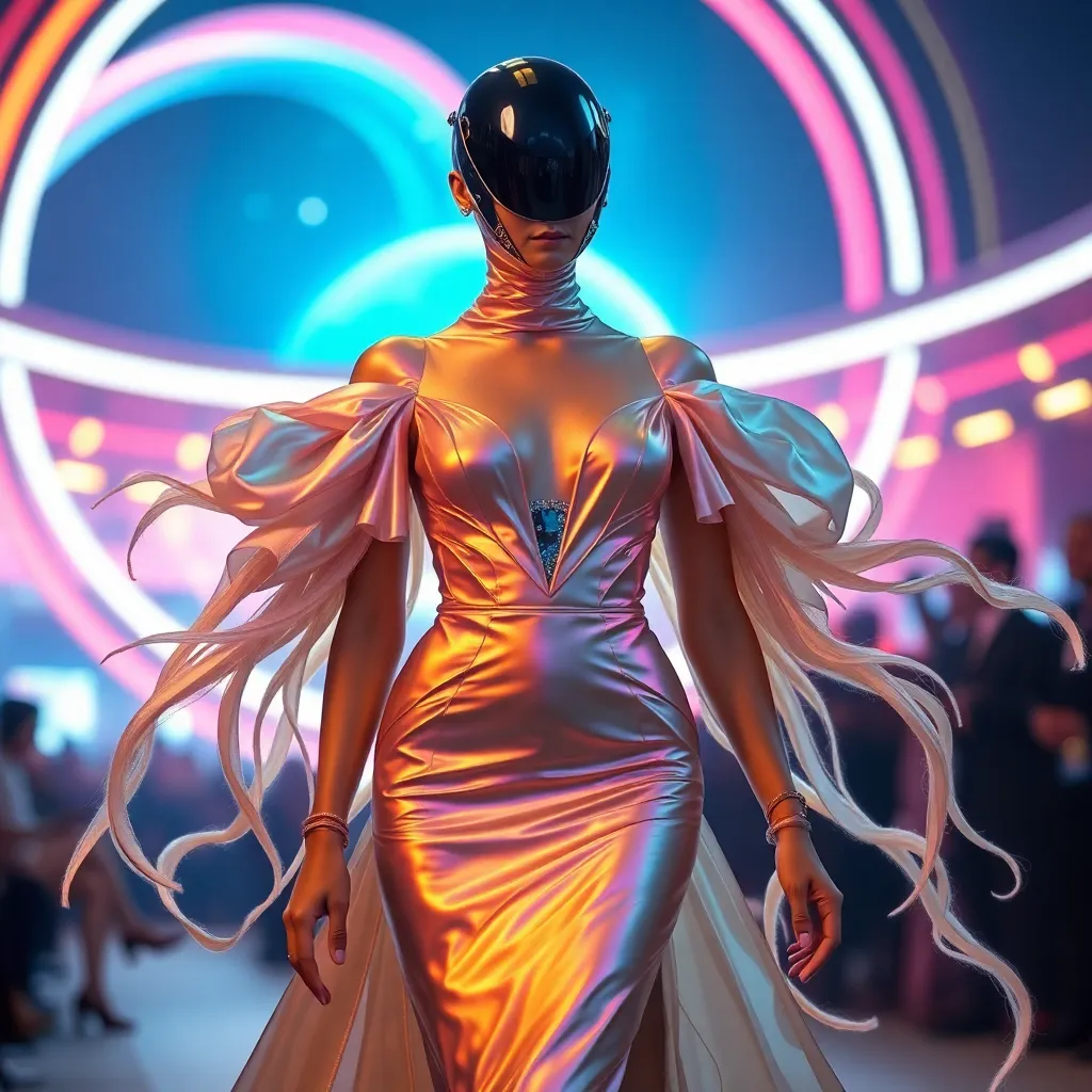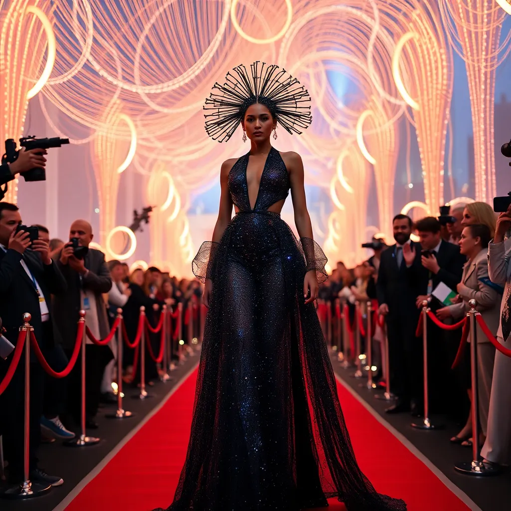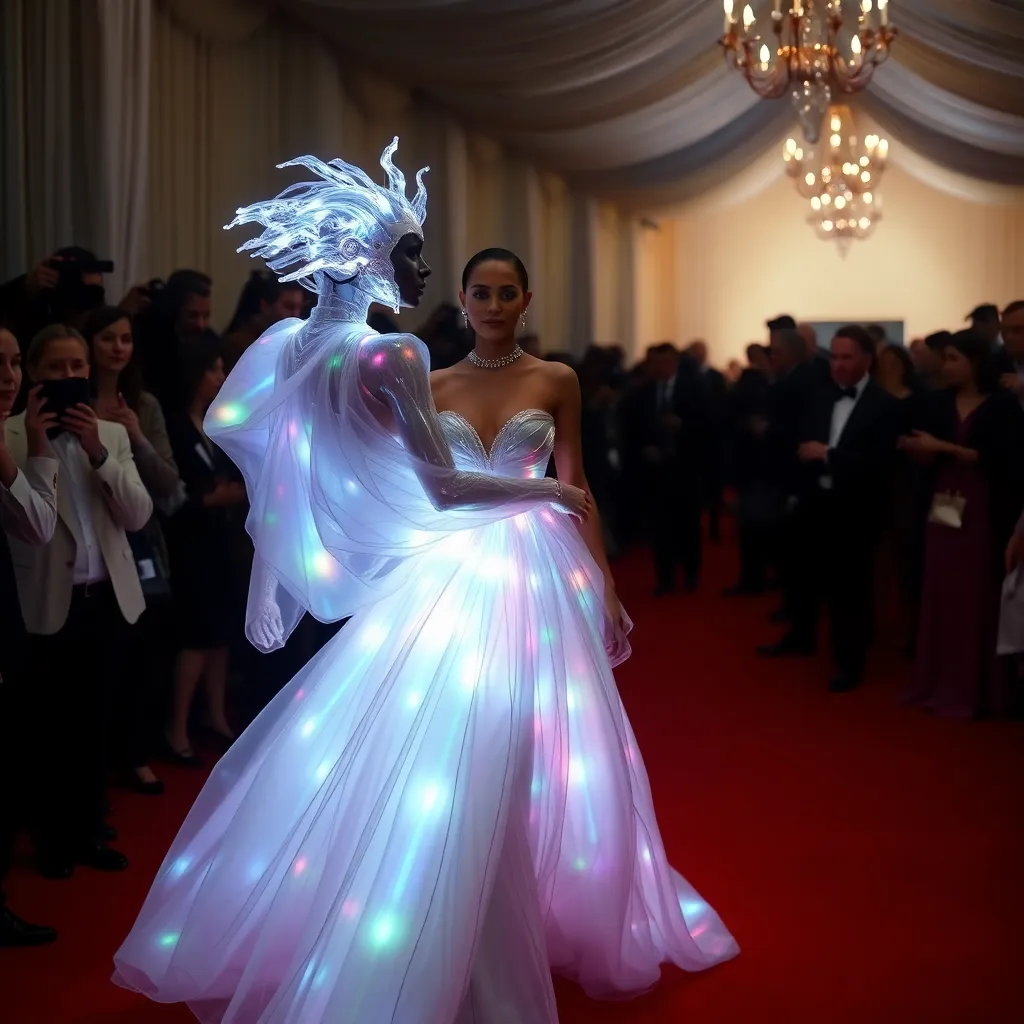 Envision a futuristic Met Gala red carpet, where avant-garde fashion meets cutting-edge technology. A celebrity guest arrives in a flowing, iridescent gown that shimmers with LED lights, paired with a futuristic headpiece that morphs into a living, breathing entity. The dress is designed by a renowned fashion house and crafted with eco-friendly materials.