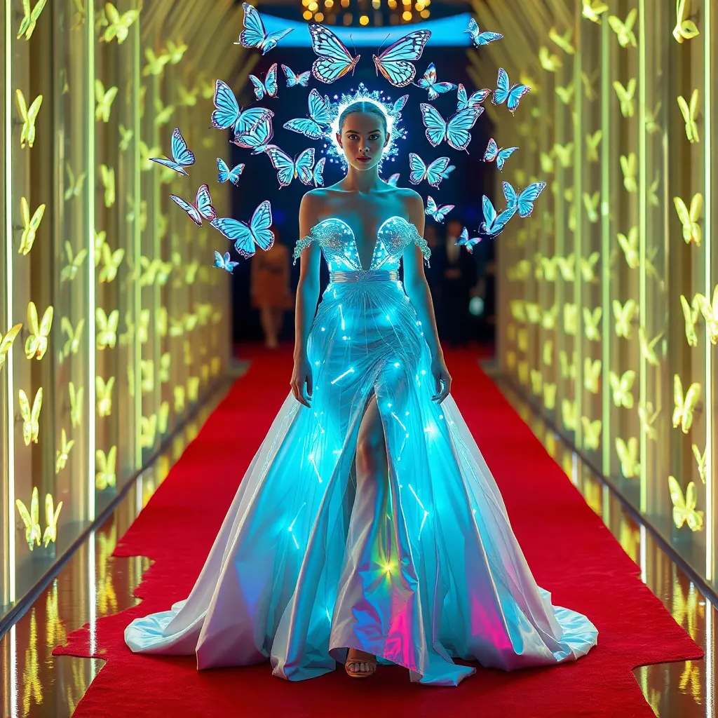 Imagine a futuristic Met Gala red carpet, where bold fashion meets cutting-edge technology. Envision a gown made of iridescent fabrics, shimmering with LED lights, worn by a stunning model surrounded by a halo of holographic butterflies. Capture the essence of innovation and glamour in this futuristic fashion fantasy.