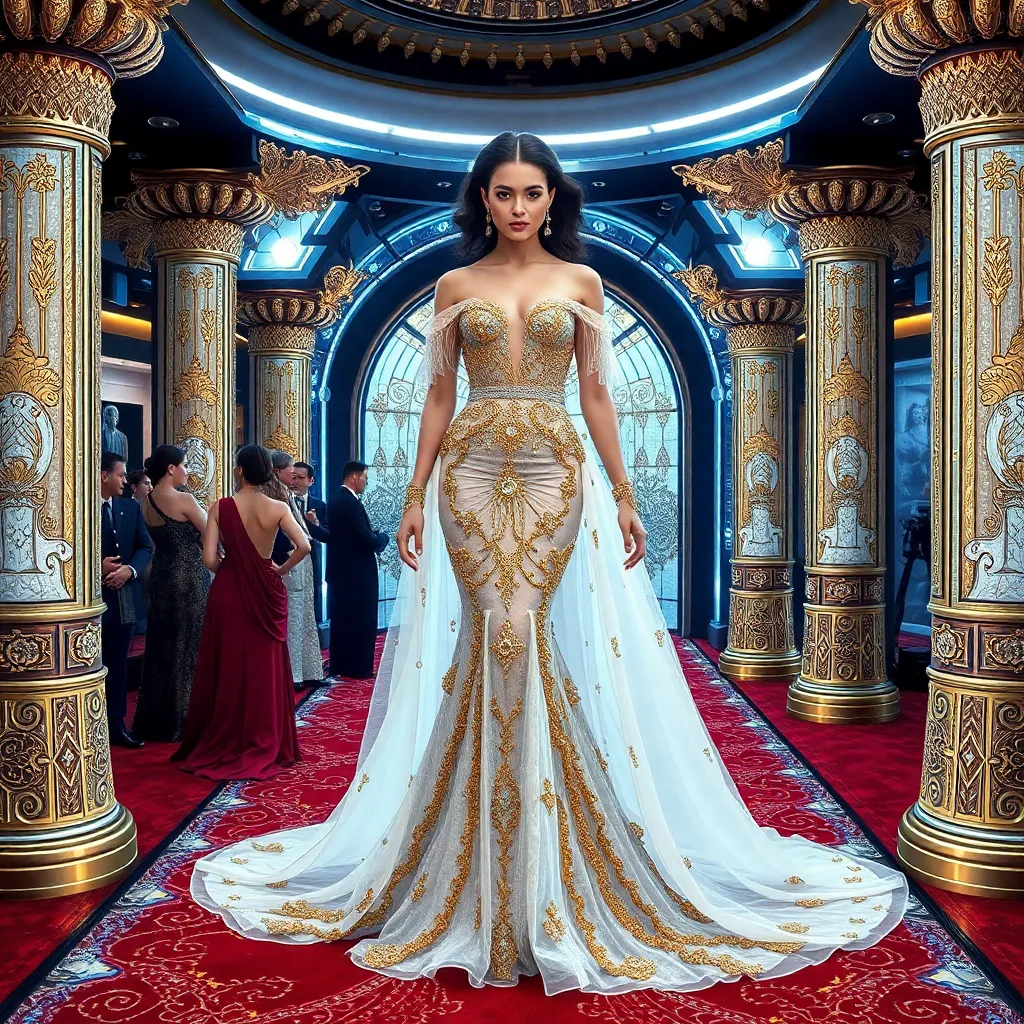 Imagine a futuristic Met Gala red carpet, where celebrities embody the theme 'Gilded Age Revival'. Design a stunning gown for a Hollywood star, blending opulent fabrics, intricate beading, and avant-garde silhouettes. Incorporate elements of ancient mythology, architectural details, and a touch of whimsy to create a truly show-stopping look.