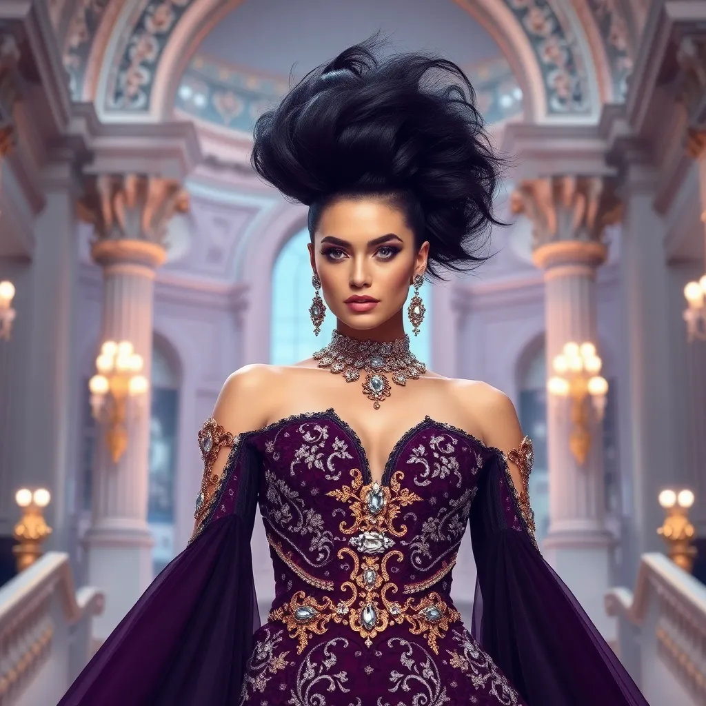 Create a stunning AI-generated image for the Met Gala, set against a backdrop of opulent architecture. Incorporate a regal, avant-garde gown with intricate details and a bold, daring hairstyle. Accents of gold, silver, and gemstones add a touch of luxury. The overall look exudes confidence, creativity, and a dash of rebellion.