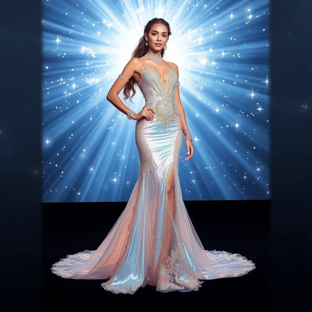 Imagine a futuristic Met Gala red carpet, where celebrities arrive in avant-garde ensembles inspired by the cosmos. Design a gown that combines iridescent fabrics, glowing accents, and intricate beading, as if the stars themselves have come to life. What will this celestial fashion statement look like?