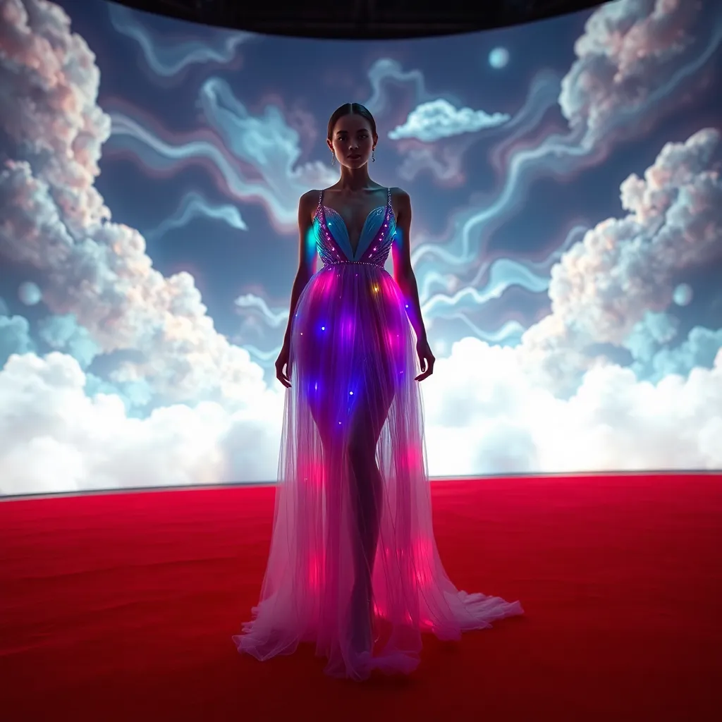Imagine a futuristic Met Gala red carpet, where fashion meets technology. A model, dressed in a flowing, iridescent gown with built-in LED lights, poses amidst a backdrop of swirling clouds and holographic projections. The dress changes colors and patterns as she moves, reflecting the beauty of the digital age.