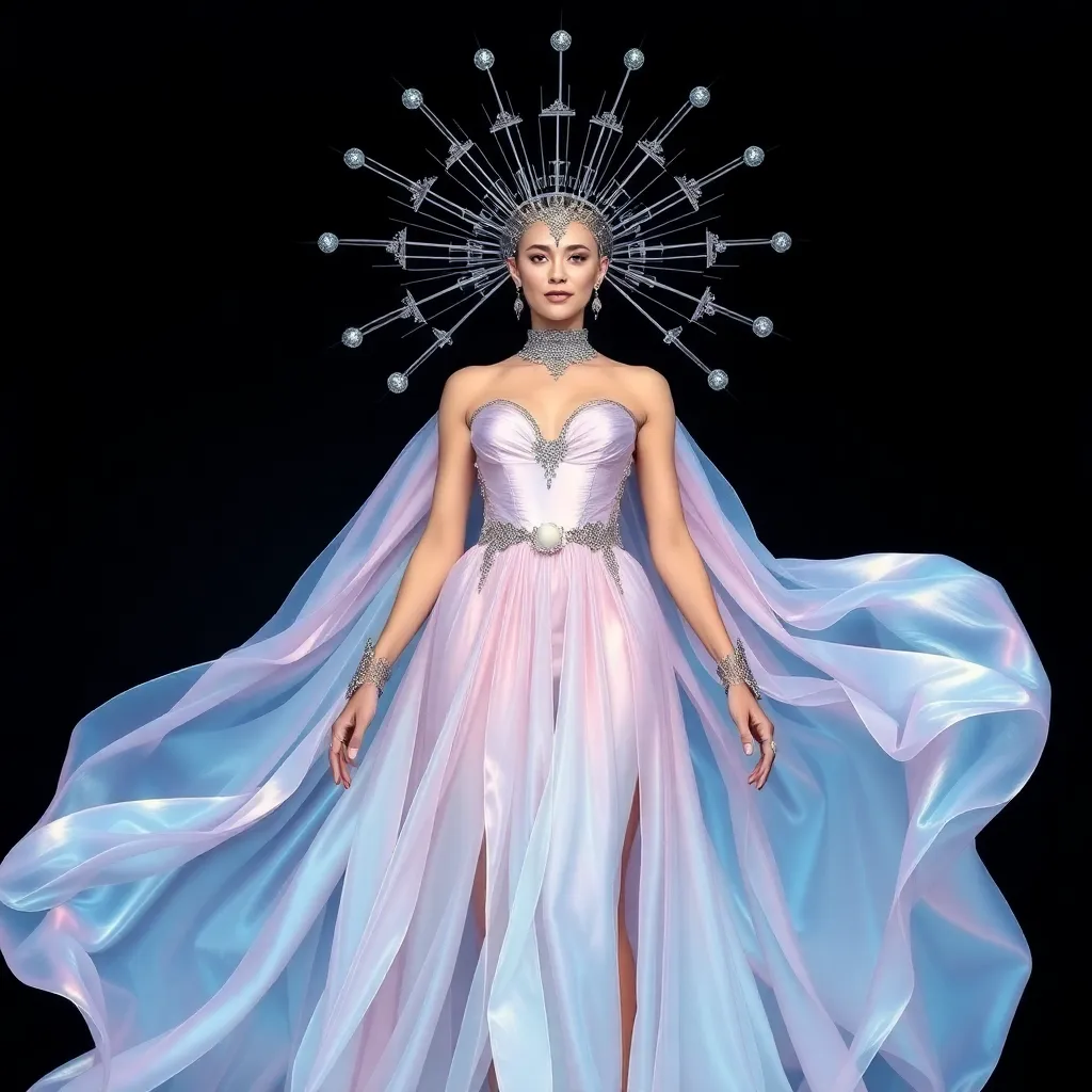 Design a stunning Met Gala look for a futuristic diva. Imagine a flowing, iridescent gown that shimmers like the night sky, paired with a dramatic, architectural headpiece that seems to defy gravity. Incorporate metallic accents and intricate details that capture the essence of a celestial being descending to Earth.