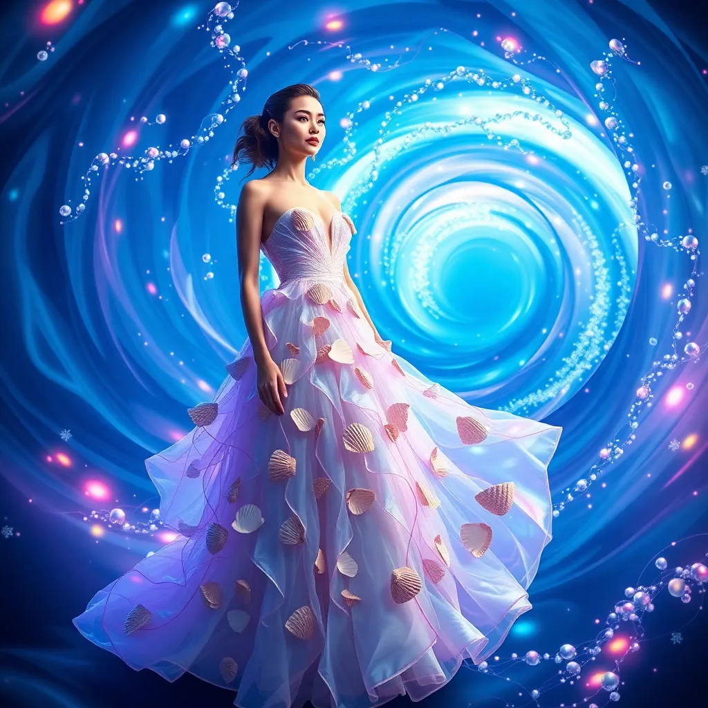 Imagine a futuristic Met Gala where guests wear avant-garde, eco-friendly attire inspired by the beauty of the ocean. Create an AI-generated image of a stunning celebrity in a flowing, iridescent gown with seashell details, surrounded by a swirling vortex of oceanic colors and bioluminescent accents.