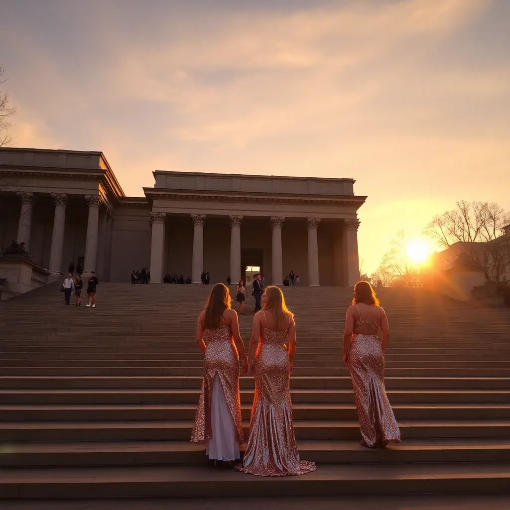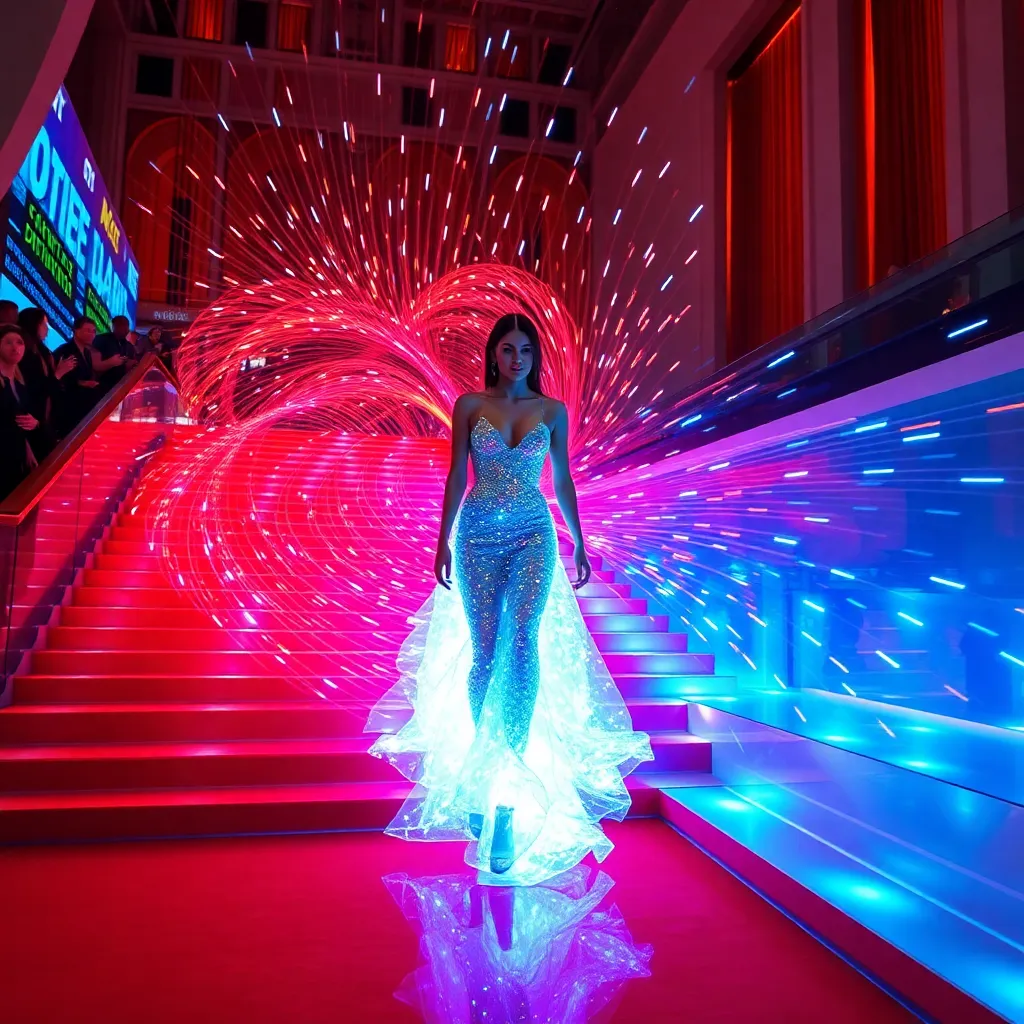 Envision a futuristic Met Gala red carpet, where fashion and technology converge. A stunning model, dressed in a shimmering, holographic gown, walks the stairs, surrounded by a swirling vortex of lights and colors. The dress reacts to her movements, changing patterns and colors in a mesmerizing display of innovation.