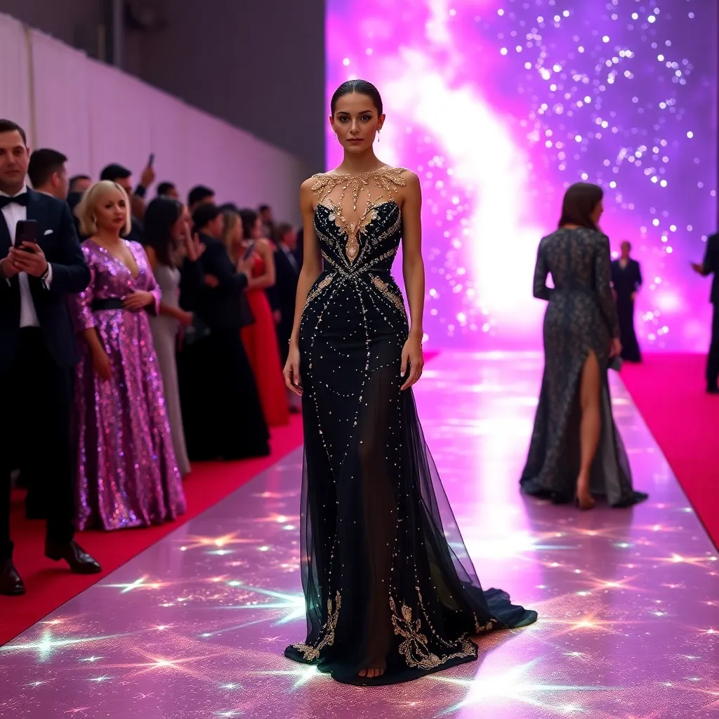 Imagine a futuristic Met Gala, where celebrities walk the red carpet in outfits inspired by the cosmos. Design a gown that combines iridescent fabrics, holographic accents, and intricate beading to evoke the majesty of a supernova. The model, a stunning celestial being, strikes a pose amidst a backdrop of twinkling stars.
