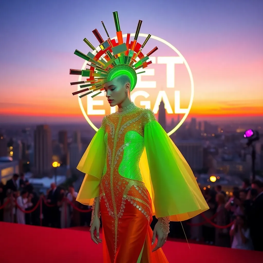 Create a Met Gala-inspired image featuring a futuristic, avant-garde ensemble on the red carpet. Incorporate bold, neon hues and intricate details. The model's hairstyle should resemble a fusion of architecture and art. The background should be a cityscape at sunset, with a giant, glowing Met Gala logo dominating the sky.