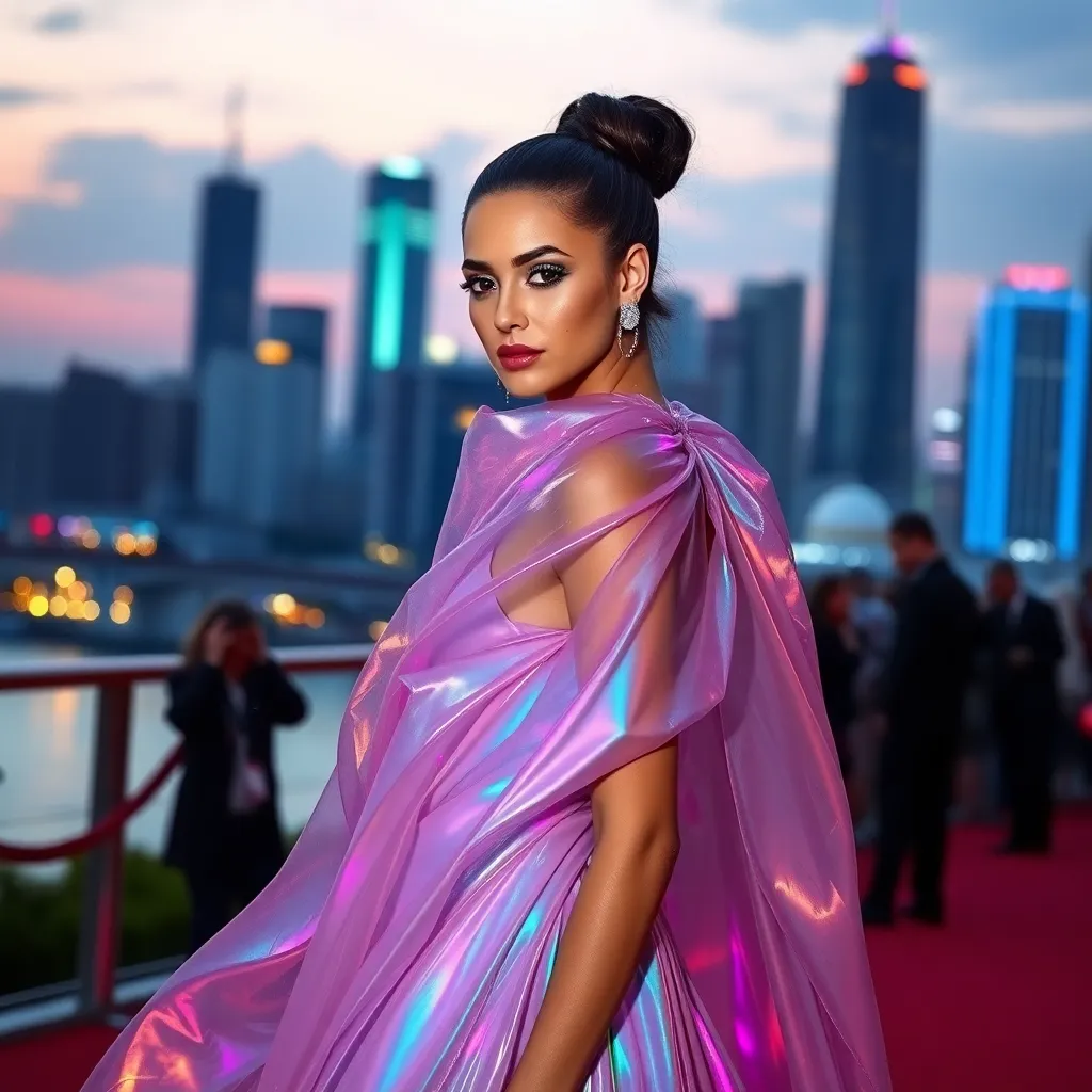 Envision a futuristic Met Gala red carpet, where a stunning model stands out in a flowing, iridescent gown that shimmers like the stars. Her hair is styled in an avant-garde updo, and her eyes are lined with glittering silver. The background is a cityscape at dusk, with neon lights reflecting off the water.