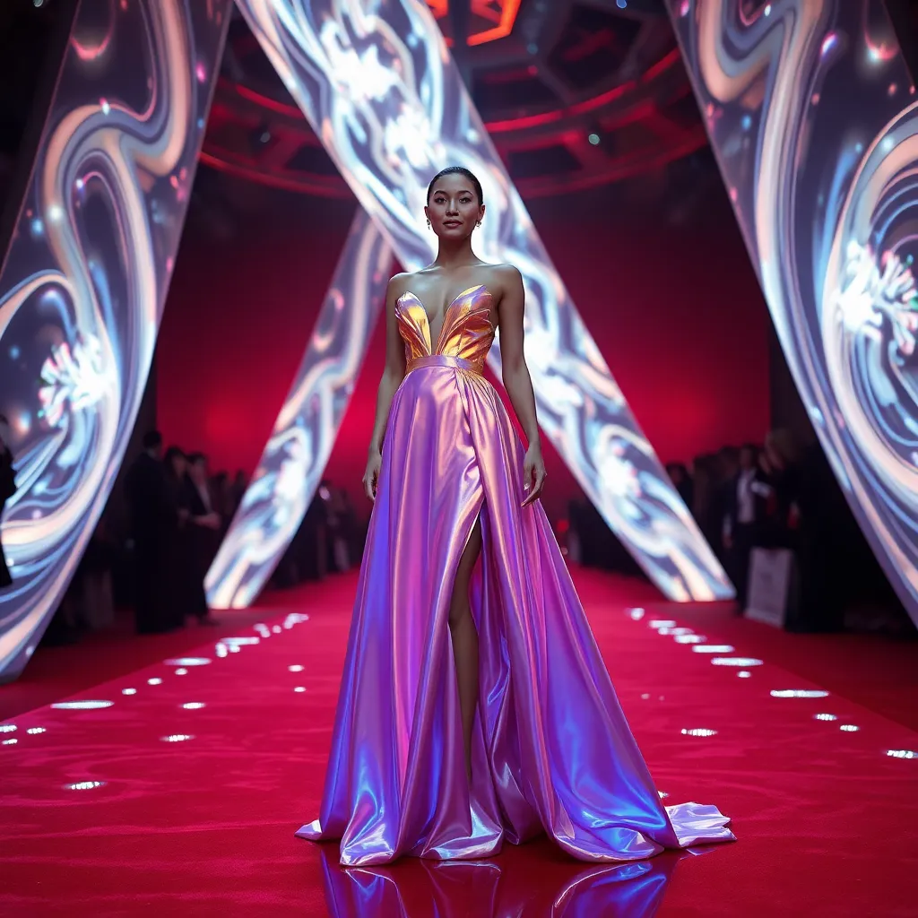 Envision a futuristic Met Gala red carpet, where a stunning celebrity guest, dressed in a bespoke, iridescent gown, poses confidently amidst a backdrop of swirling LED lights and holographic projections. The dress shimmers and changes colors in harmony with the surrounding visuals, creating a mesmerizing display of fashion and technology.