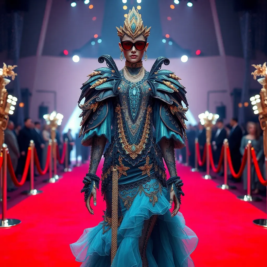 Create a stunning Met Gala-inspired AI image featuring a glamorous, avant-garde outfit on a red carpet backdrop. Incorporate intricate details, bold colors, and a touch of futuristic flair. Imagine a fusion of high-fashion and sci-fi elements, as if a futuristic world collided with the iconic fashion event.
