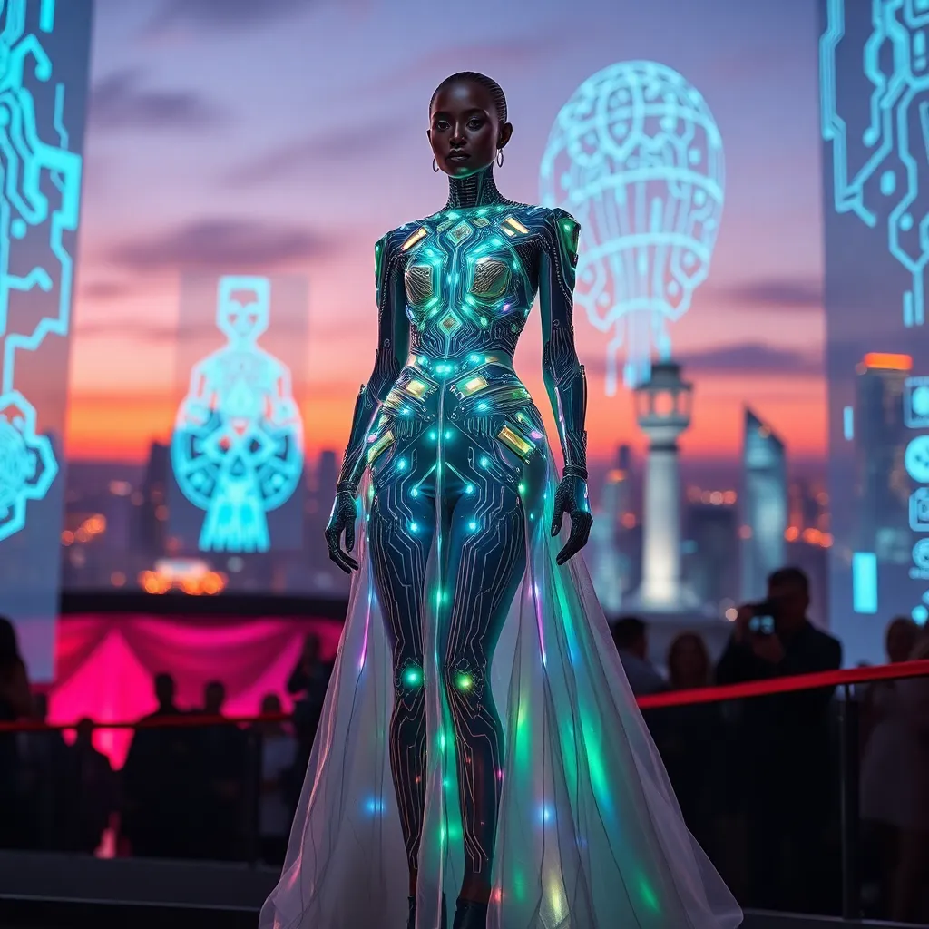 Envision a futuristic Met Gala scene where fashion meets technology. Design a stunning gown made from iridescent fabrics, illuminated by LED lights, and adorned with intricate circuitry patterns. The model, a cyborg, stands confidently amidst a backdrop of holographic projections and a cityscape at dusk.