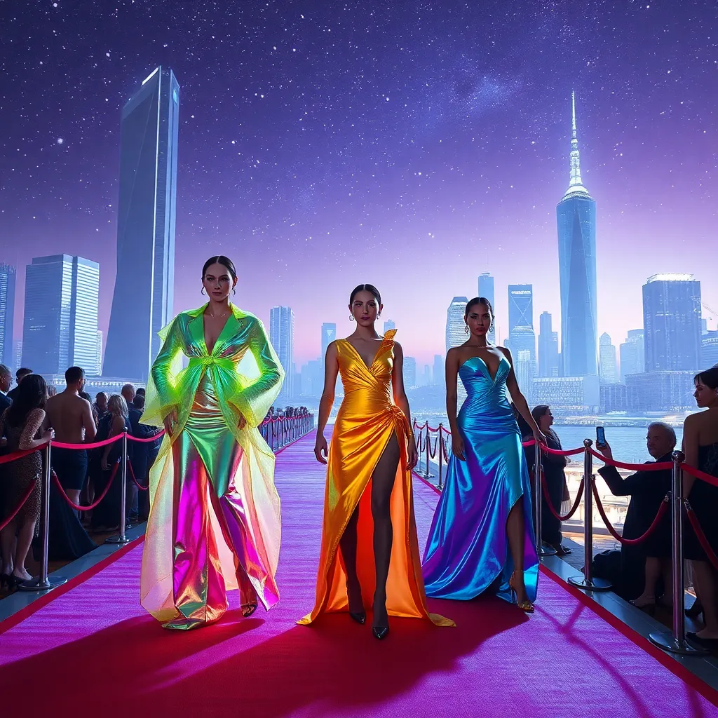 Envision a futuristic Met Gala red carpet where models don avant-garde attire inspired by the cosmos. Imagine neon hues, iridescent fabrics, and architectural silhouettes. The theme is 'Stellar Expressions' and the setting is a futuristic cityscape with towering skyscrapers and a starry night sky. Create a mesmerizing AI image.