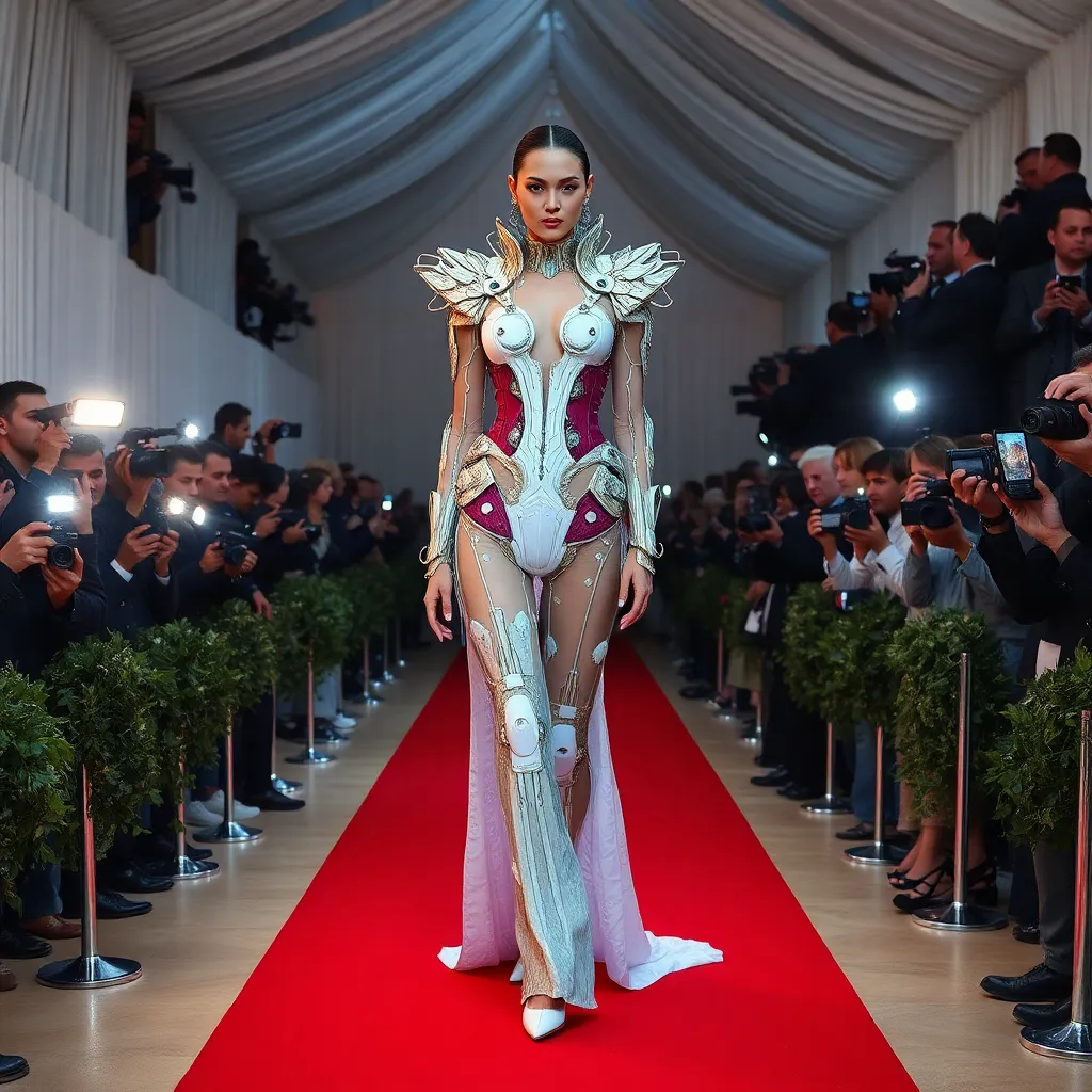 Imagine a futuristic Met Gala red carpet, where avant-garde fashion meets cutting-edge technology. Design a show-stopping outfit for a celebrity guest, incorporating sustainable materials, intricate details, and a touch of whimsy. The theme is 'Fashioning the Future' – create an image that blends style, innovation, and eco-consciousness.