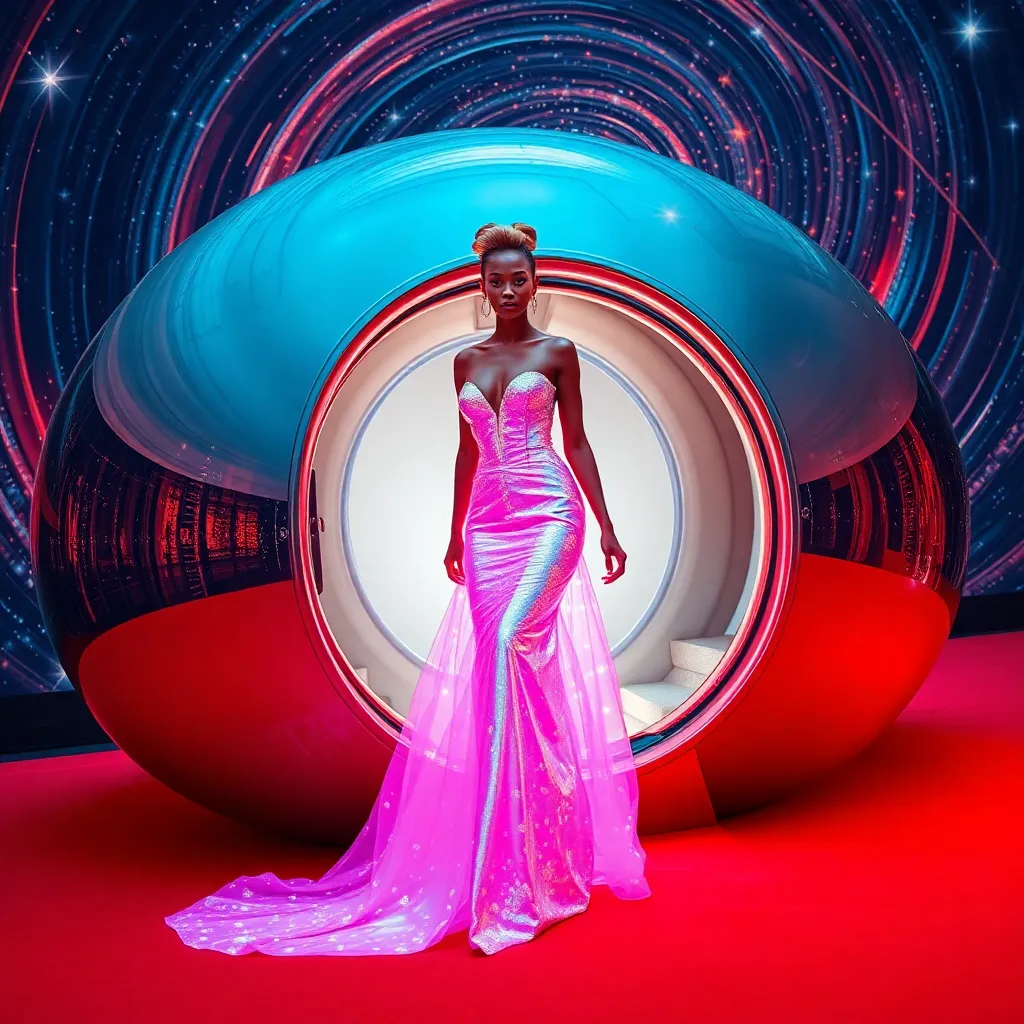 Envision a futuristic red carpet scene at the Met Gala. A stunning guest, dressed in a bespoke, neon-lit gown, steps out of a gleaming silver spaceship. The dress shimmers with iridescent colors, while the model's hair is styled in a futuristic updo. The background is a swirling vortex of stars and galaxies.