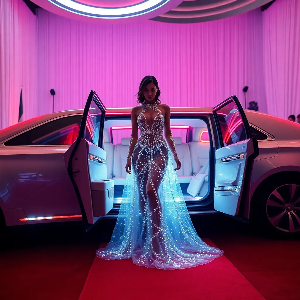 Envision a futuristic Met Gala red carpet, where a stunning celebrity steps out of a sleek, neon-lit limousine. The dress is a mesmerizing fusion of art and technology, with intricate LED patterns dancing across the fabric. The theme is 'Gilded Futurism.' What does this futuristic fashion icon look like?