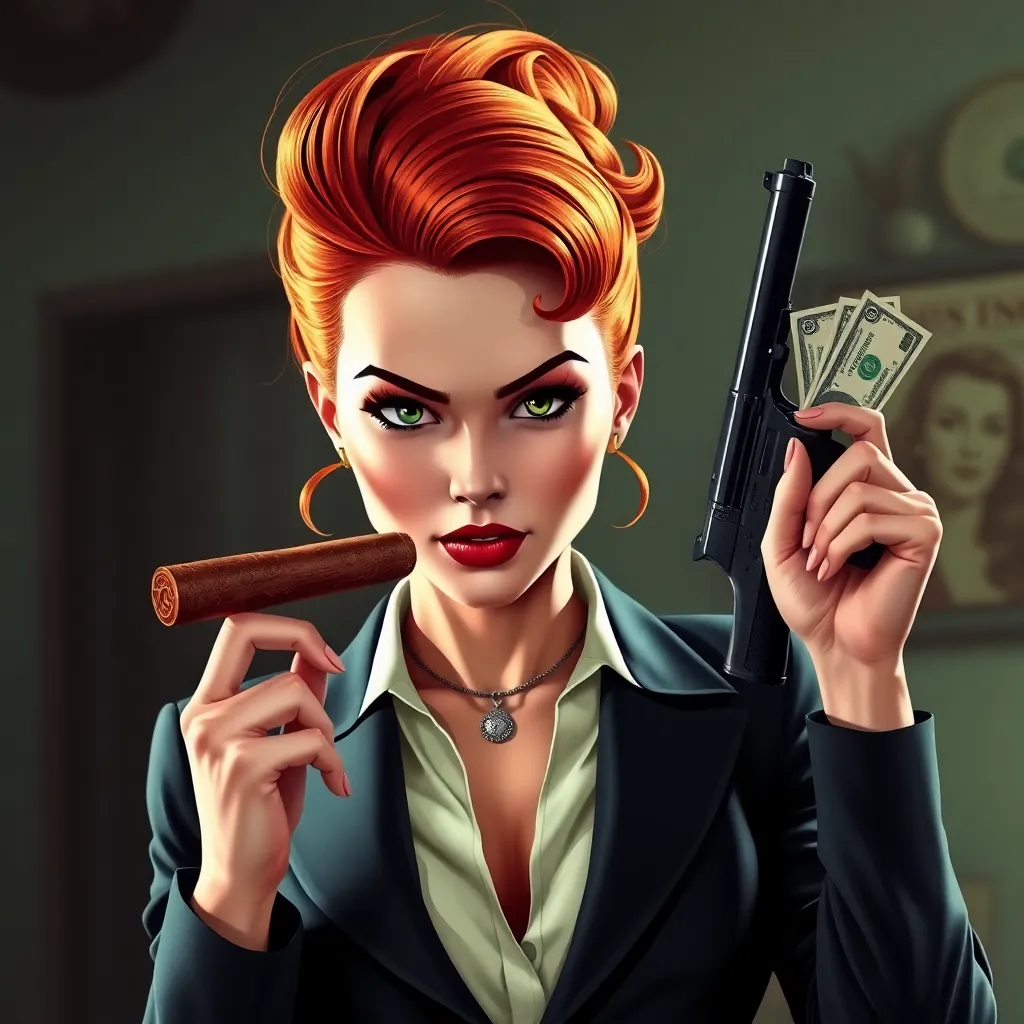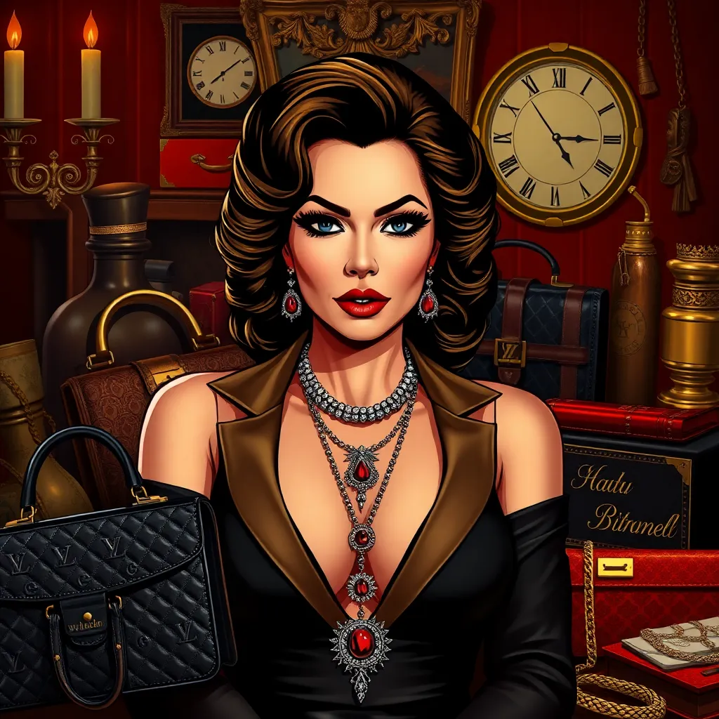 Create an AI-generated image of a tough, sassy, and stylish mob wife, surrounded by the trappings of luxurious her lifestyle. Think designer handbags, expensive jewelry, and a bold, fiery personality. Include a subtle nod to her organized crime connections, such as a cigar or a diamond-encrusted gun.