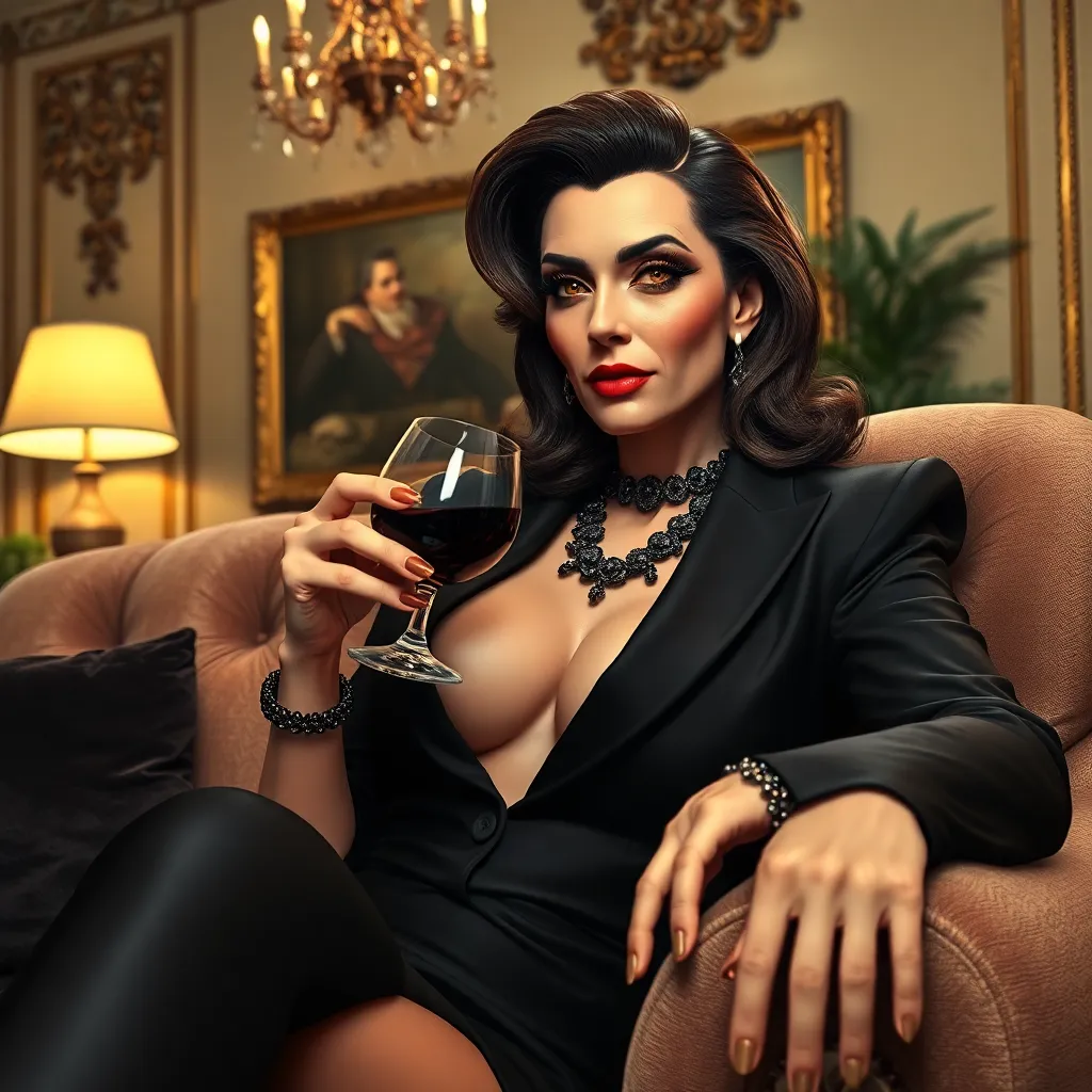 Vito's daughter, Karen Gravano, stands confidently in a luxurious living room, surrounded by designer furniture and expensive jewelry. She's dressed in a sleek black dress, her hair styled perfectly, and a hint of sass on her face. The background is a warm, golden color, with a cityscape visible through the window.