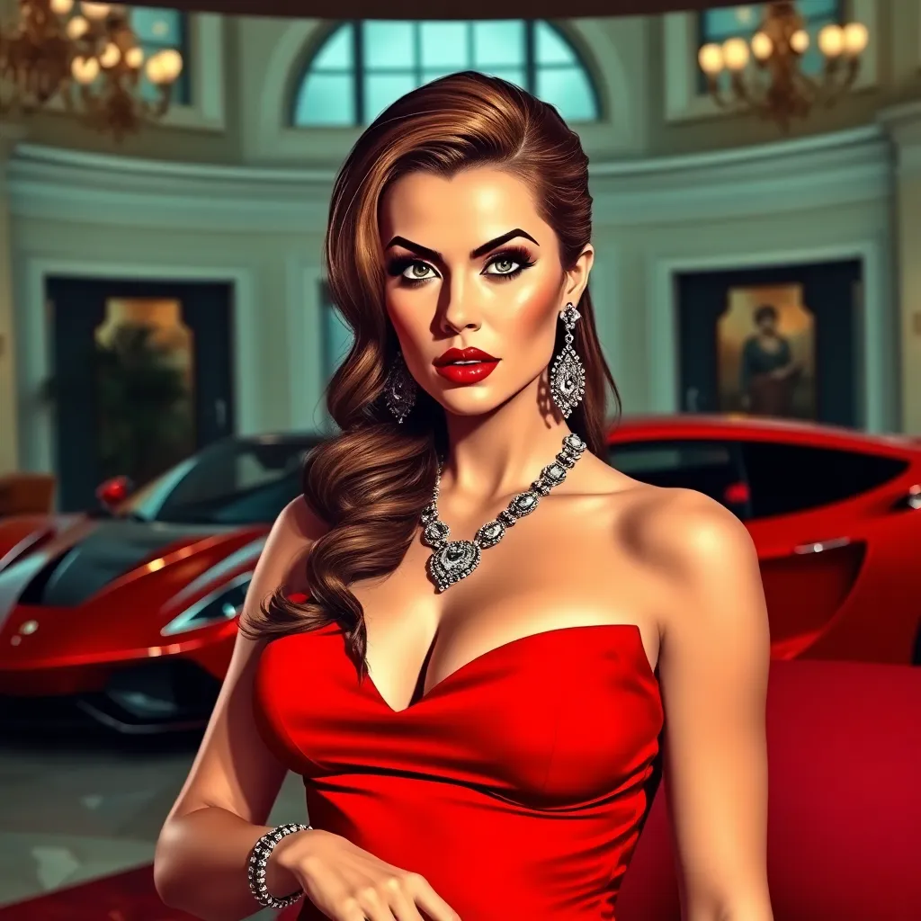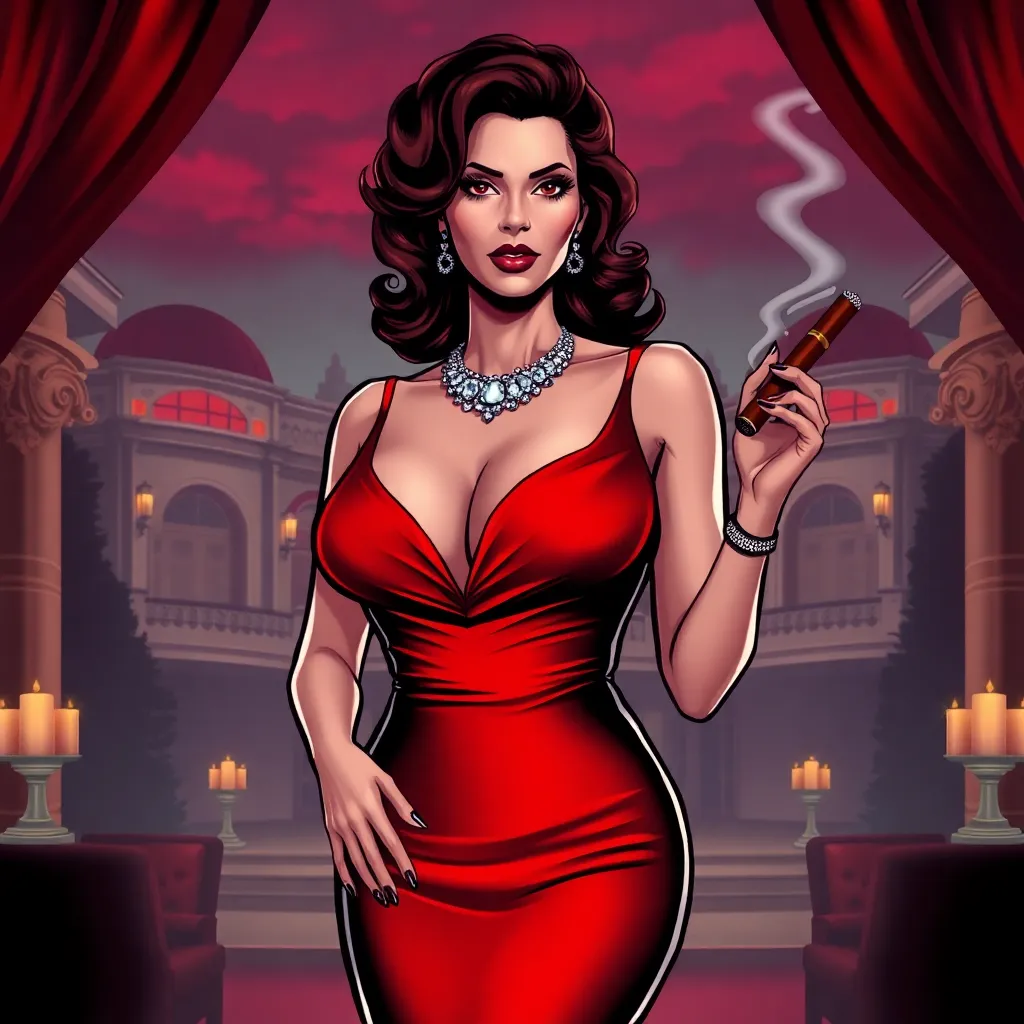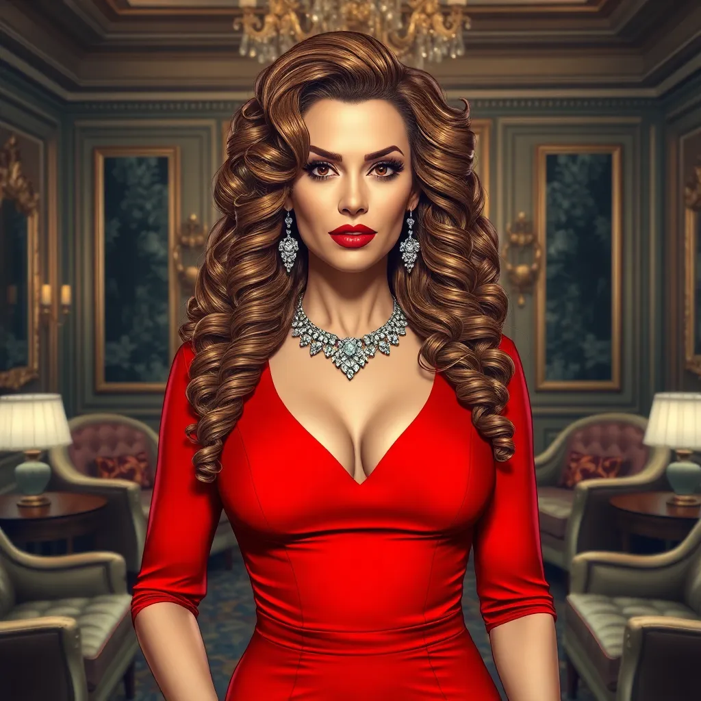 Create an AI image of a tough-as-nails mob wife, standing confidently in a luxurious mansion, surrounded by lavish furnishings and expensive jewelry. Her long, curly hair is styled perfectly, and she's dressed to impress in a stunning red dress. A diamond necklace sparkles around her neck, and a hint of a smirk plays on her lips.