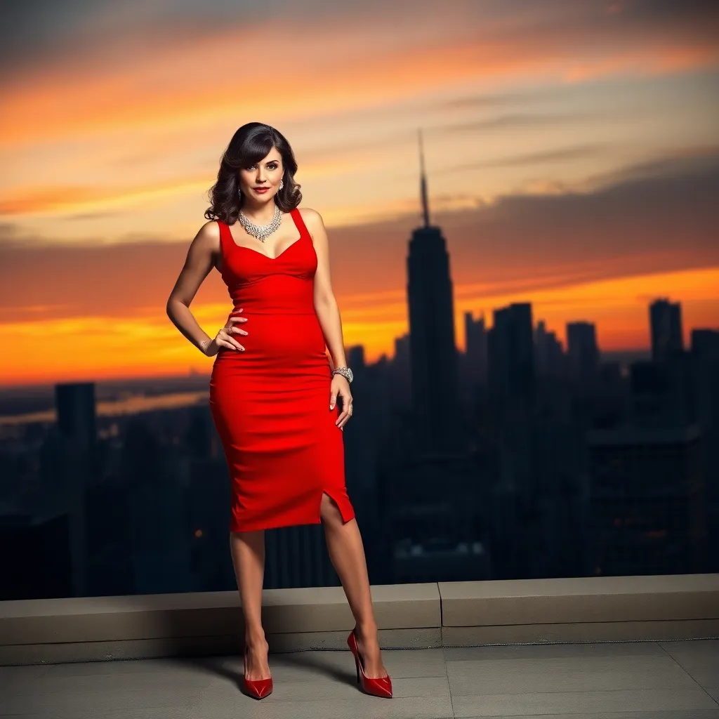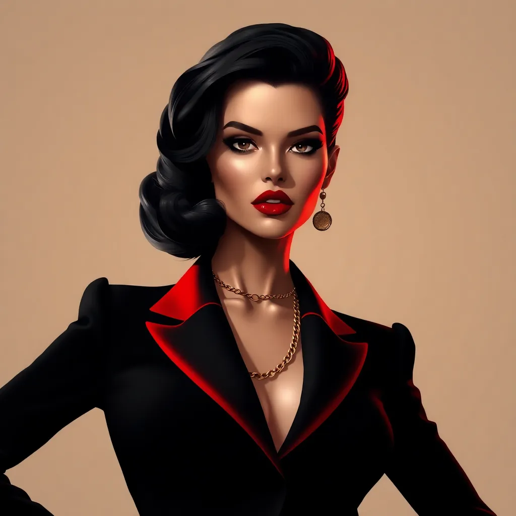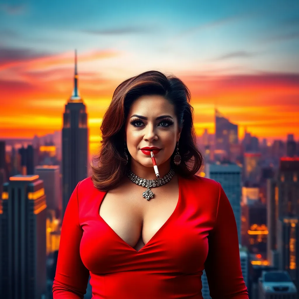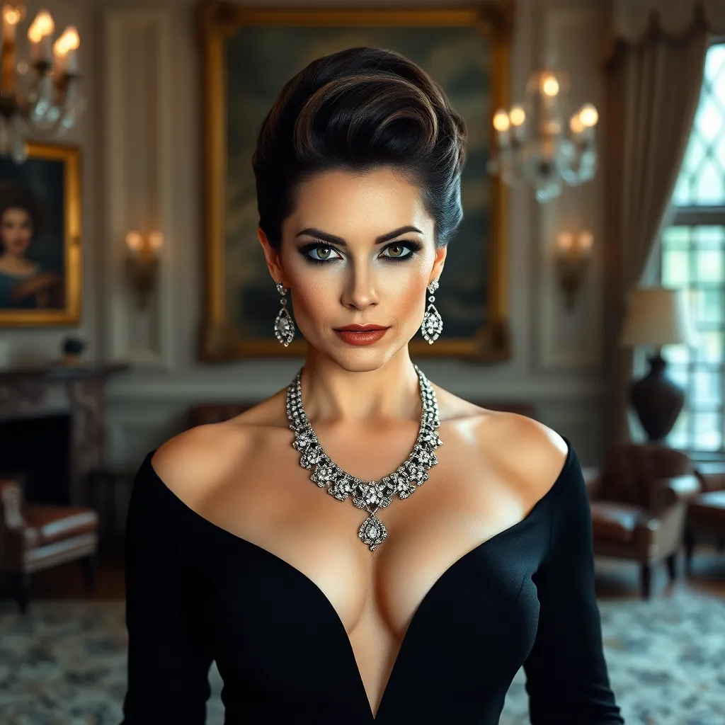Create an AI image of a tough-as-nails mob wife, standing confidently in a luxurious mansion, surrounded by lavish furnishings and expensive jewelry. Her long, curly hair is styled perfectly, and she's dressed to impress in a stunning red dress. A diamond necklace sparkles around her neck, and a hint of a smirk plays on her lips.