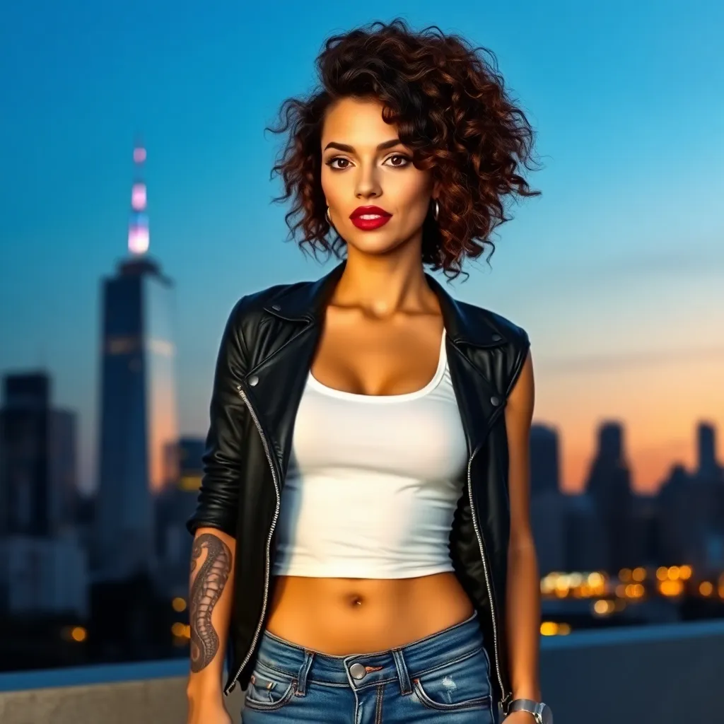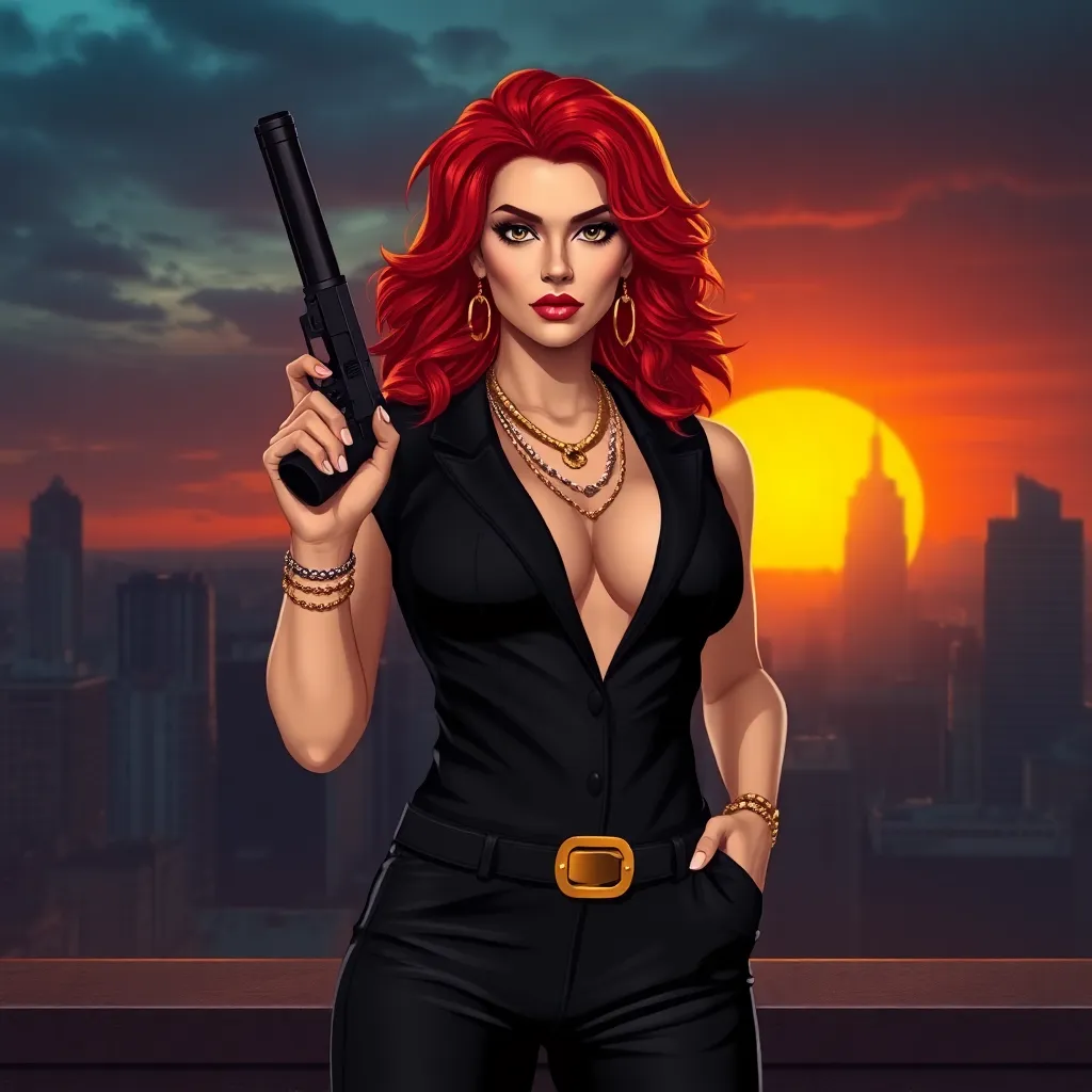 Create an AI image of a fierce and stylish mob wife, dressed in a bold red wig, designer sunglasses, and a fitted black leather jacket, holding a cigarette holder and giving a sassy pose, surrounded by a blurred background of city streets and neon lights, evoking the gritty atmosphere of a 1970s crime drama.