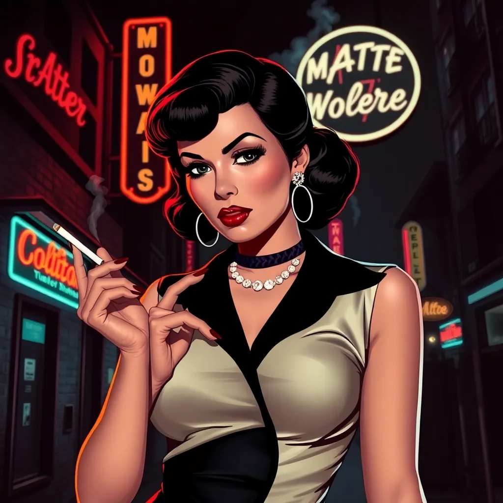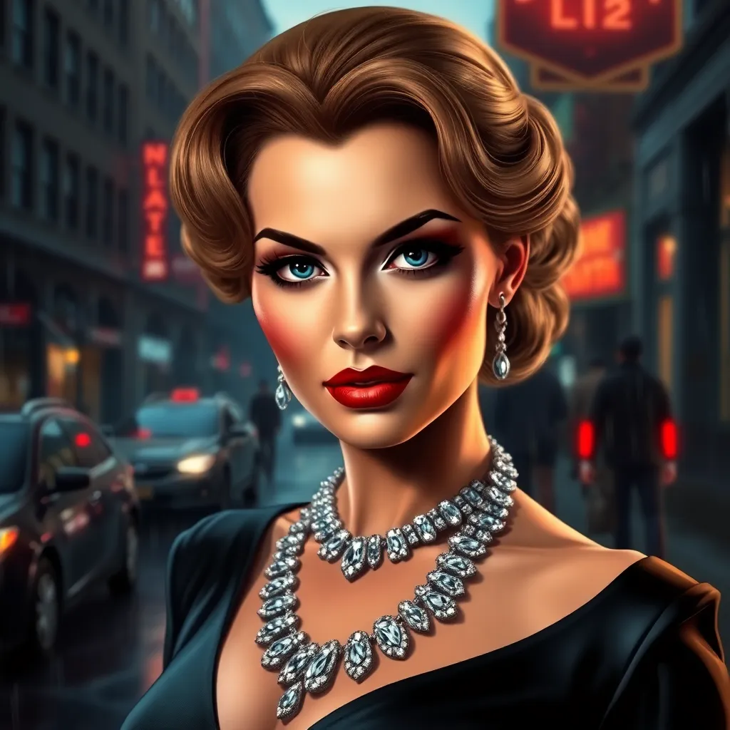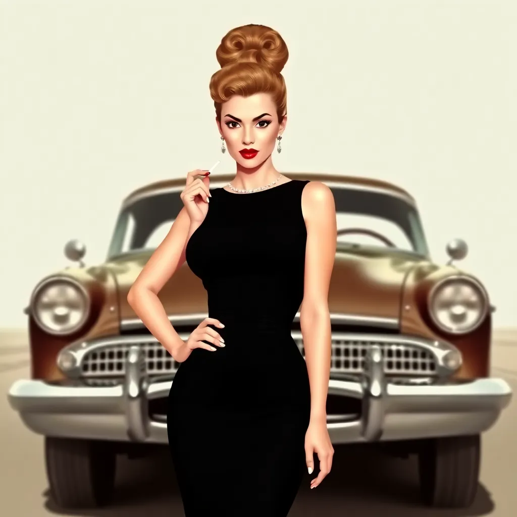 Create an AI-generated image of a fierce and stylish mob wife, dressed in a glamorous 1950s-inspired outfit, surrounded by symbols of power and luxury, such as diamonds, cigars, and a vintage sports car. Incorporate a subtle nod to her 'ob' lifestyle, like a faint tattoo or a hint of menace in her gaze.