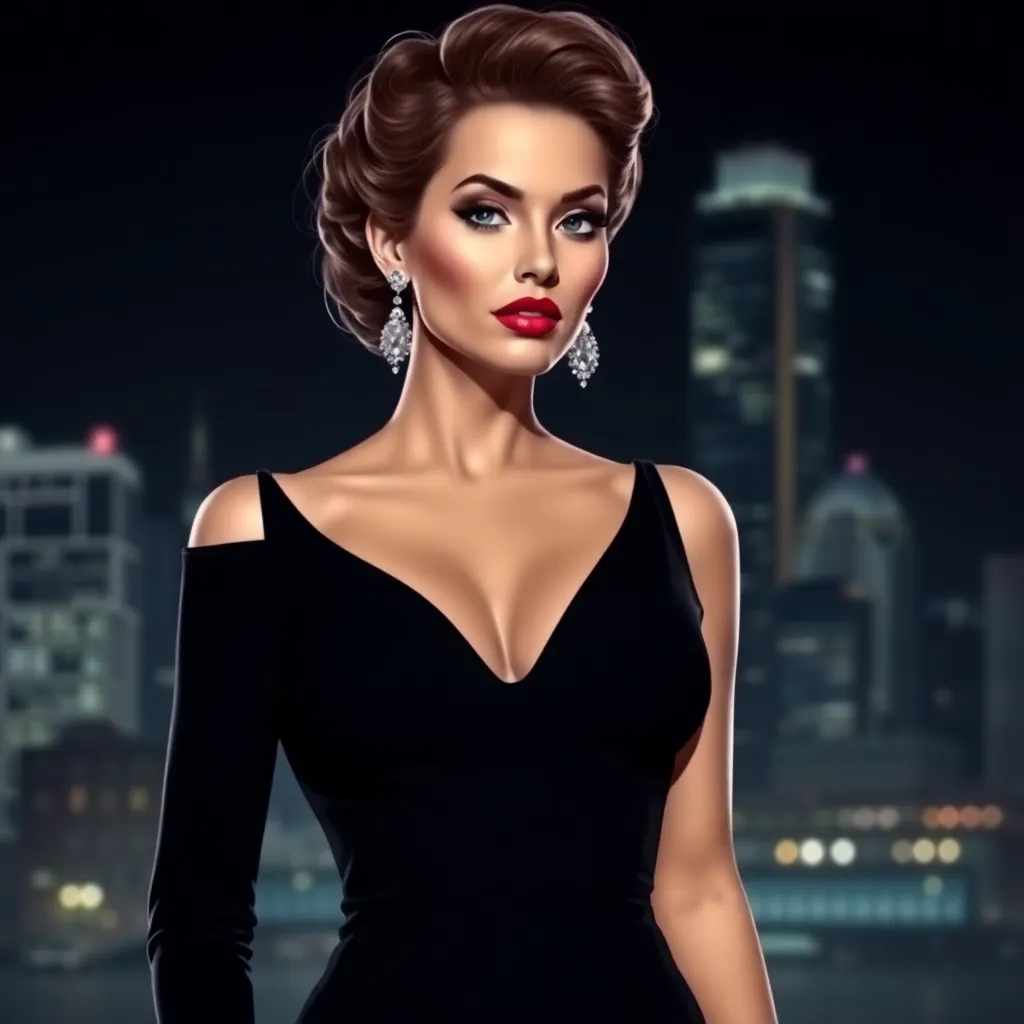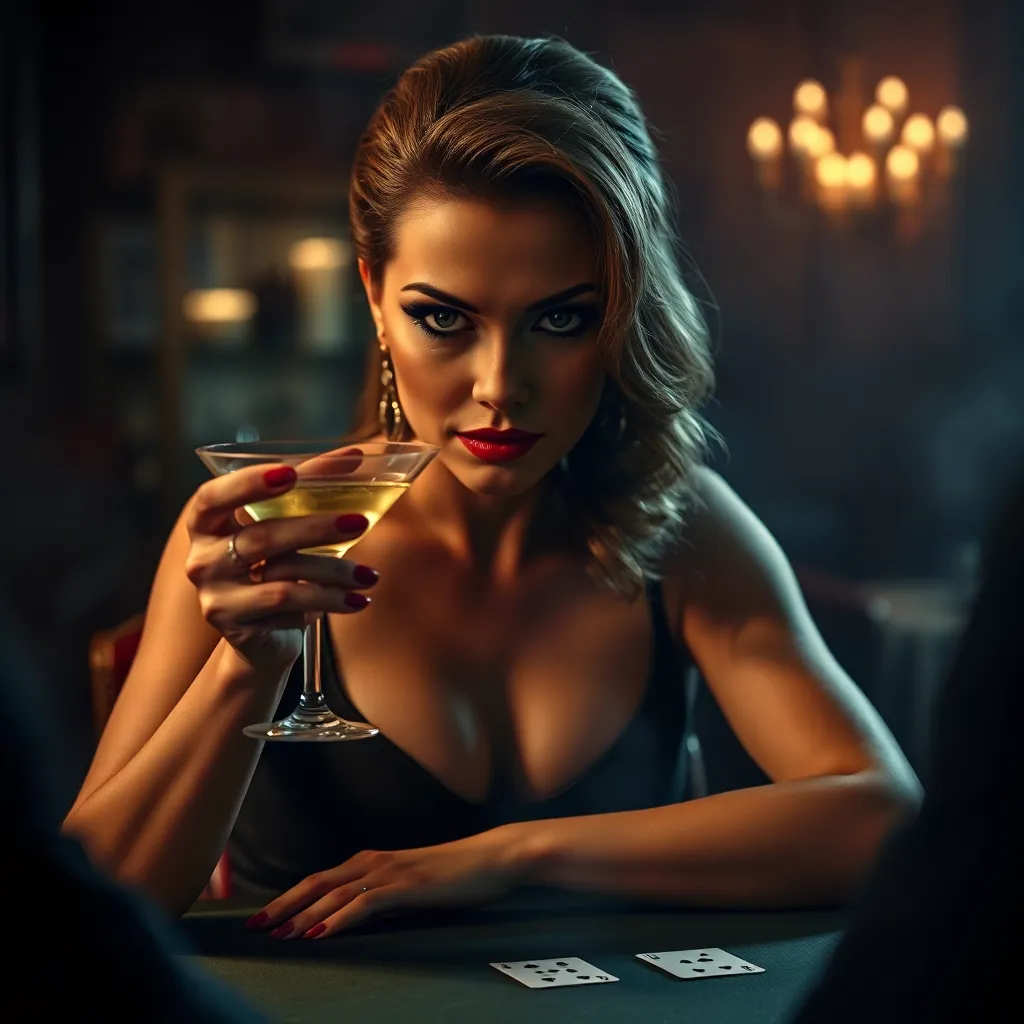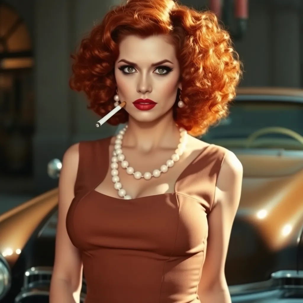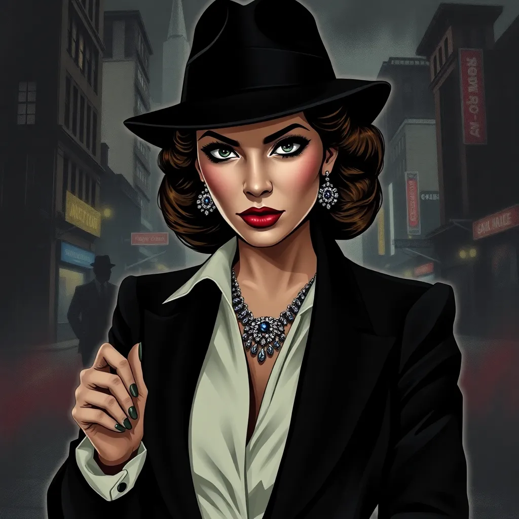 Create an AI-generated image of a fierce and stylish mob wife, dressed in a glamorous 1950s-inspired outfit, surrounded by symbols of power and luxury, such as diamonds, cigars, and a vintage sports car. Incorporate a subtle nod to her 'ob' lifestyle, like a faint tattoo or a hint of menace in her gaze.