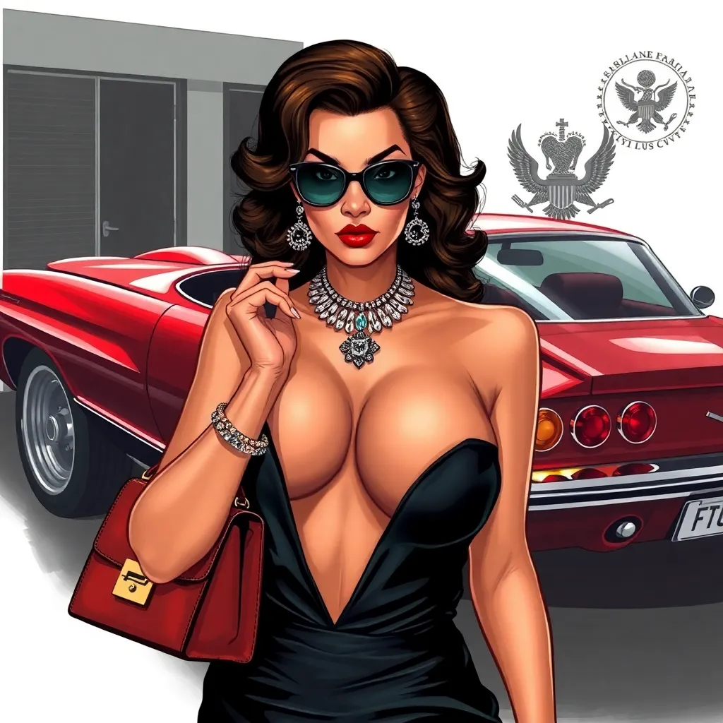 Create an AI image of a fierce and fashionable mob wife, surrounded by the trappings of her luxurious lifestyle. Think designer handbags, high-end jewelry, and a bold, fiery personality. Incorporate symbols of her 'family business' into the background, such as a vintage sports car or a subtle mafia logo.