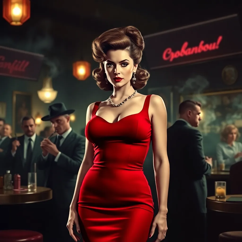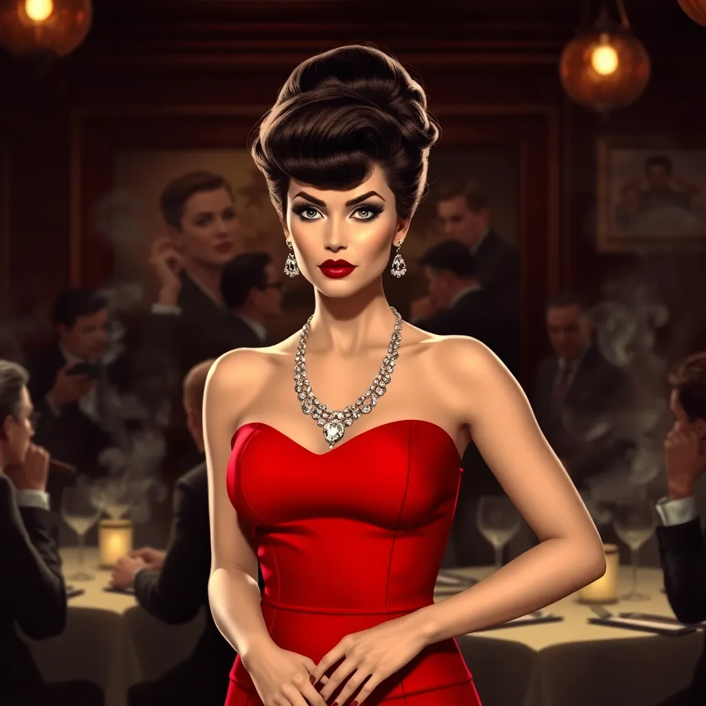 Create a dramatic image of a mob wife, a 1950s-style femme fatale, surrounded by cigar smoke and luxurious velvet drapes. She's dressed in a fitted red dress, her hair styled in a signature beehive, and her eyes narrowed in a sly, knowing gaze. Capture the essence of a powerful and alluring matriarch.