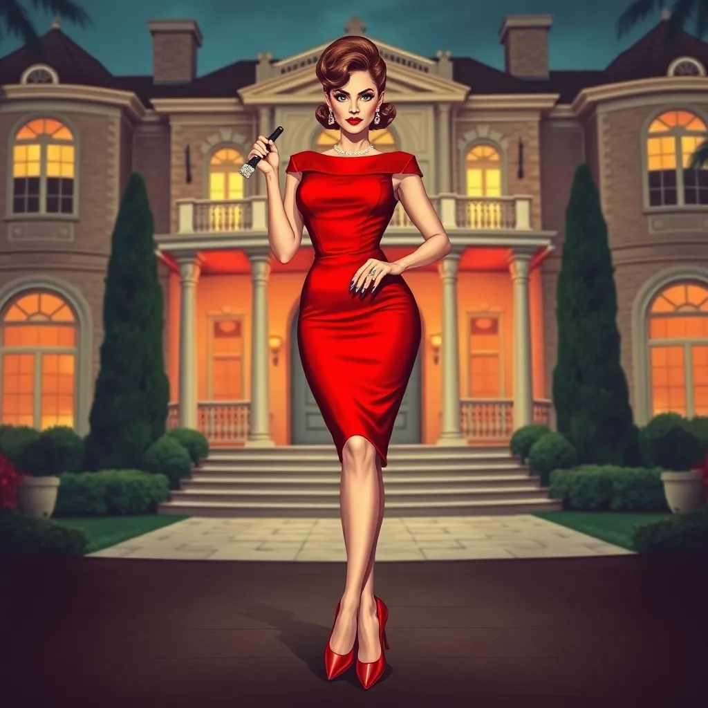Create an image of a strong and stylish mob wife, dressed in a bold red dress and matching heels, standing confidently in front of a luxurious mansion. Her hair is styled in a sleek updo, and she's holding a diamond-encrusted cigarette holder. The background should have a 1950s Italian-American flair.