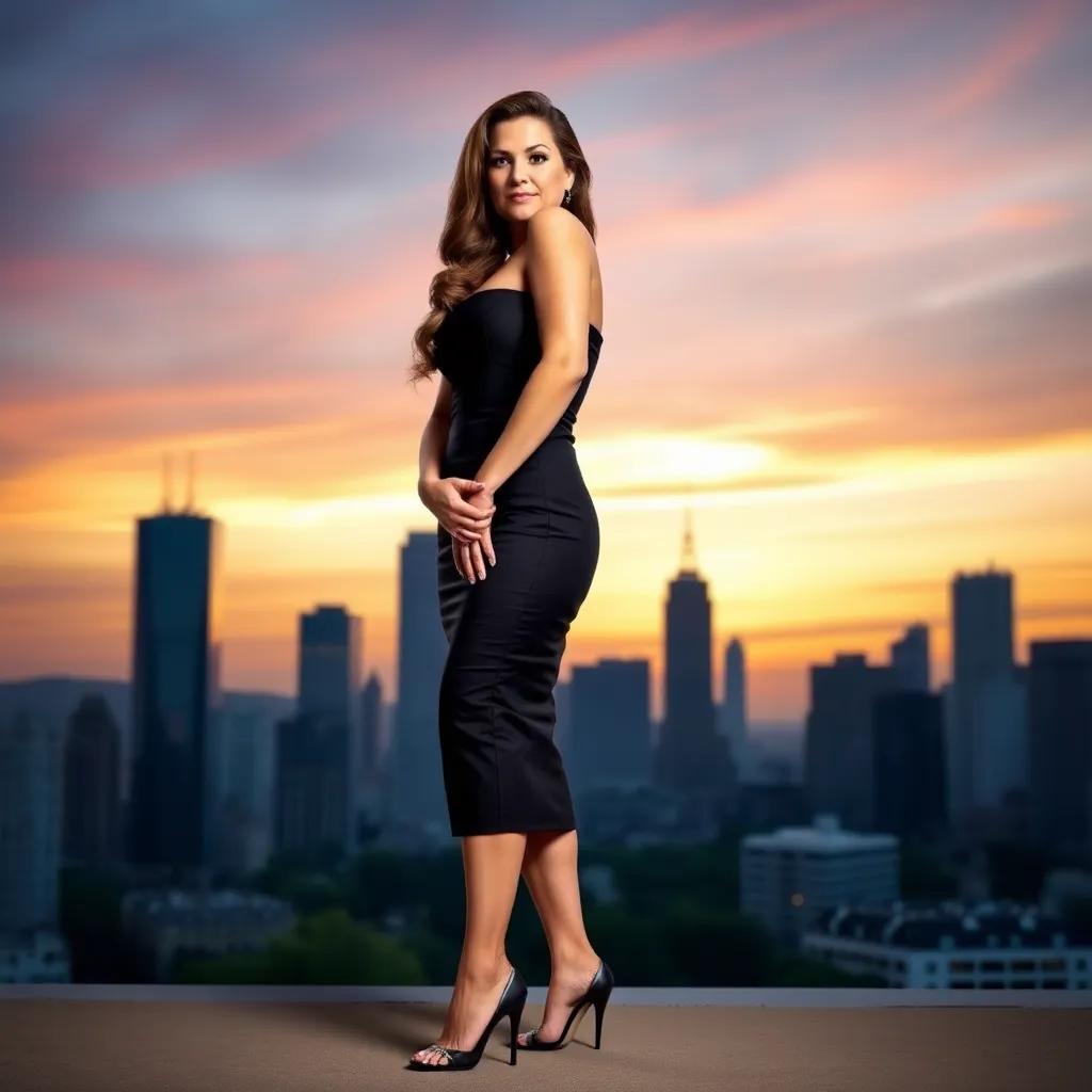 Create an AI image of a stunning mob wife, inspired by the 1990s Italian-American mafia era. She's a sassy, sophisticated, and alluring femme fatale with curly brown hair, piercing green eyes, and a glamorous red lip. Dress her in a fitted, sequined black evening gown, complete with a statement necklace and a fur shawl.