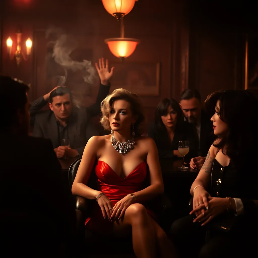 Create an image of a fierce and glamorous mob wife, sipping champagne and surrounded by the trappings of her lavish lifestyle. She's dressed to the nines in a designer gown, dripping in diamonds and pearls, with a fierce gaze and a hint of a smirk. The background is a dimly lit, smoke-filled room with a hint of Old Hollywood glamour.