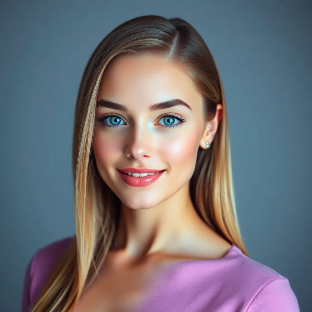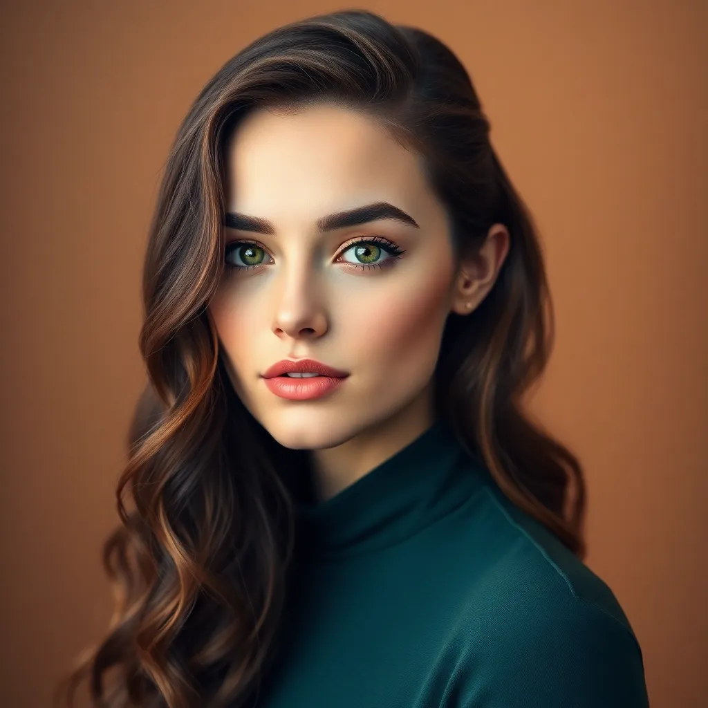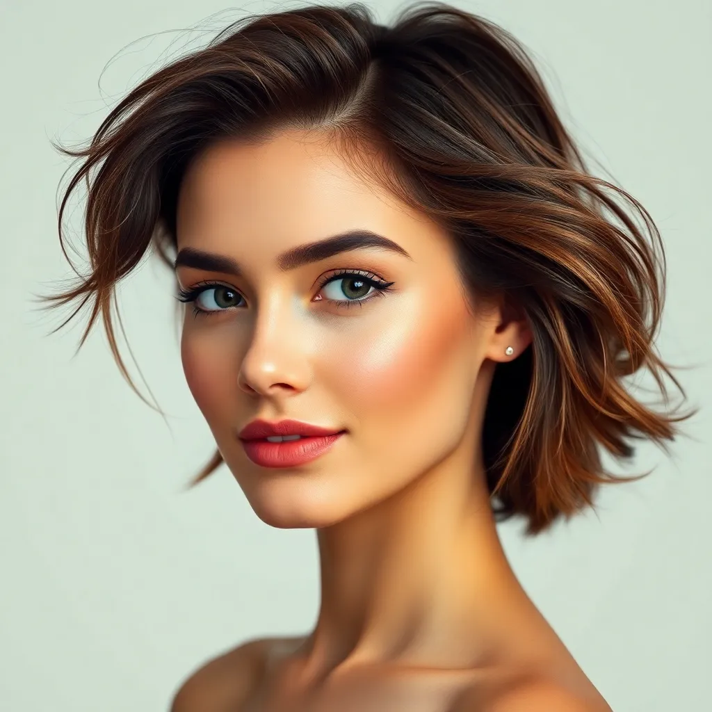 Create a stunning model headshot for a fashion brand. The model should have a confident and alluring expression, with a subtle smile. Hair should be styled in a trendy, effortless manner. Background should be a clean, neutral color. Lighting should be soft and flattering, accentuating the model's features