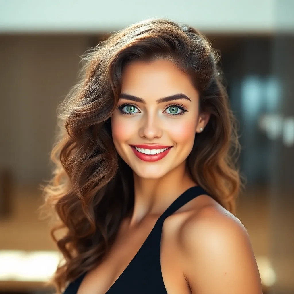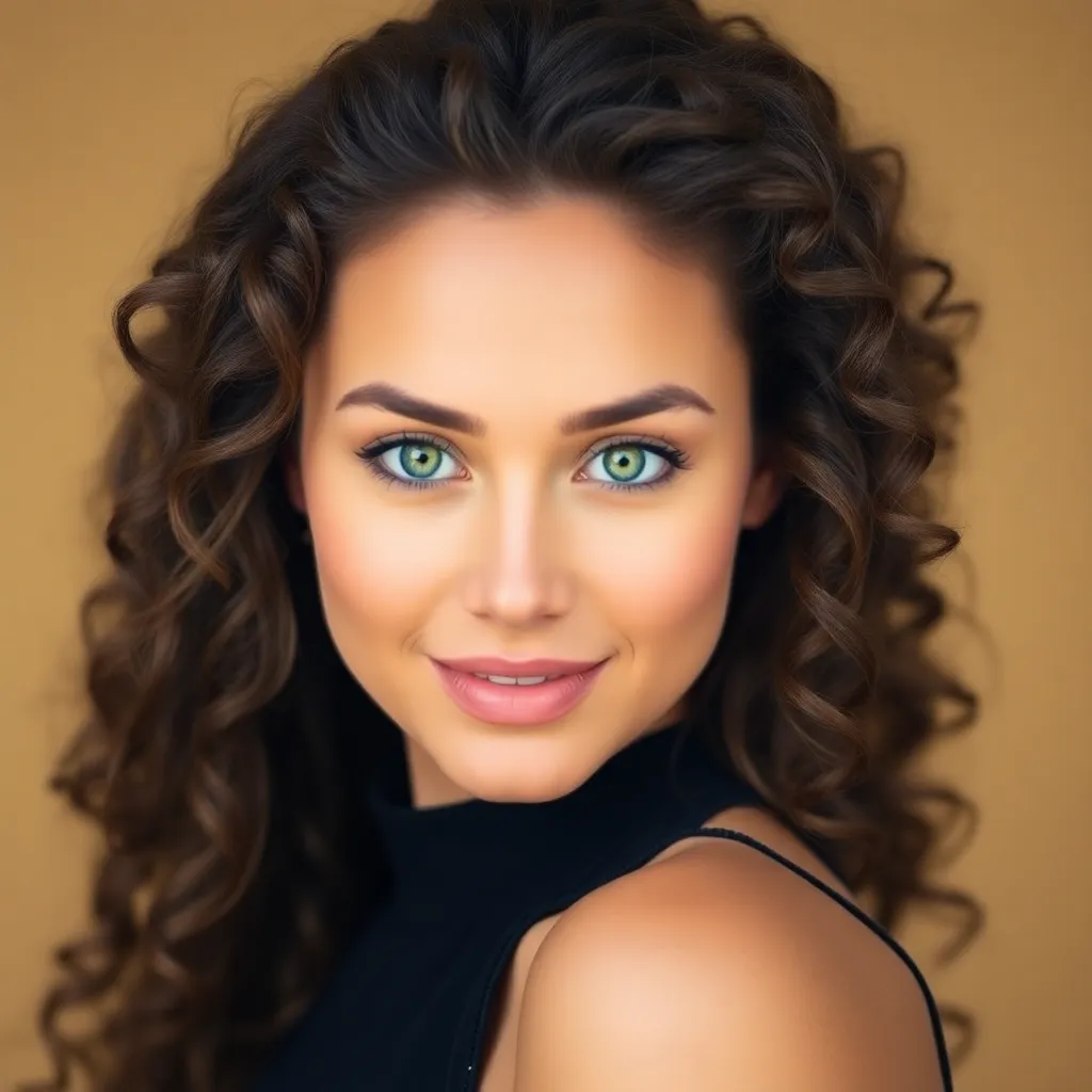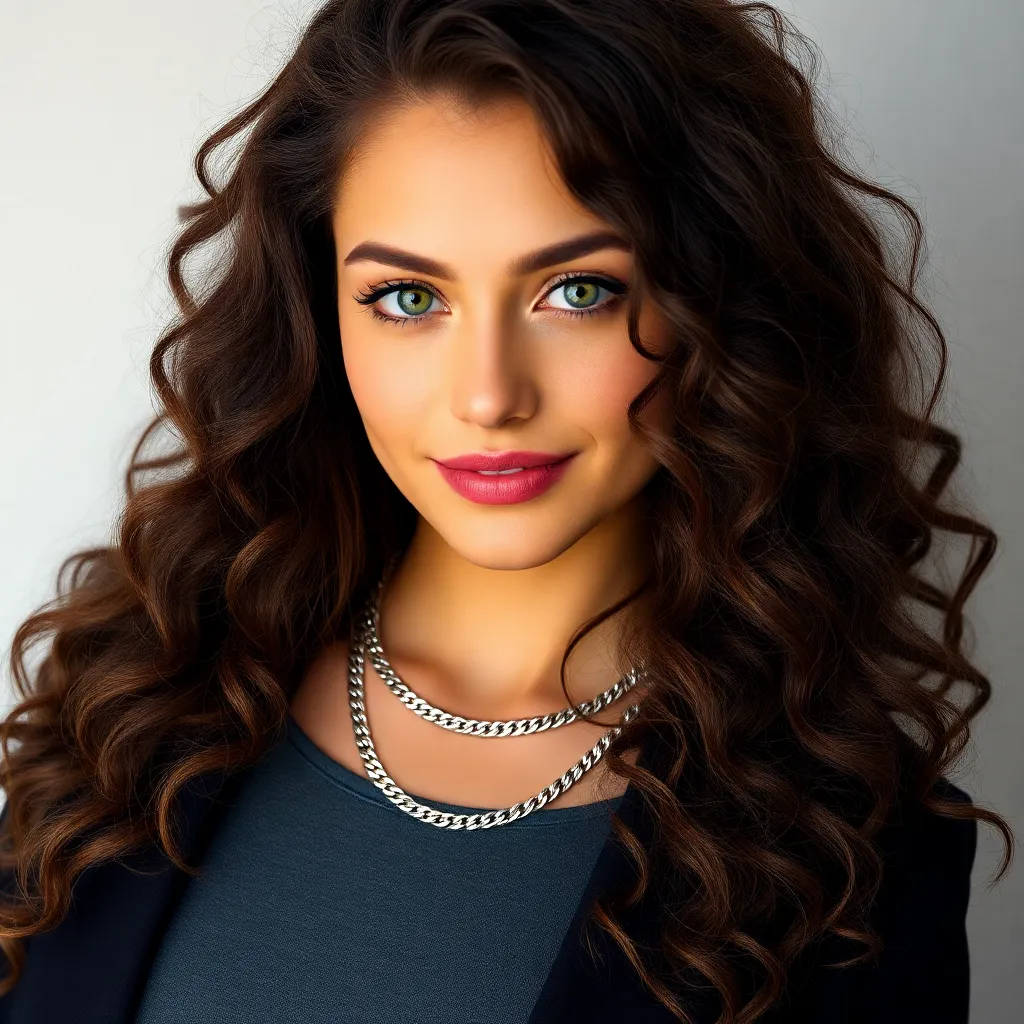 Create a stunning headshot of a confident and charismatic model. Imagine a 25-year-old woman with long, curly brown hair and bright green eyes. She's wearing a sleek black dress with a subtle sparkle and a statement silver necklace. Capture her radiant smile and captivating gaze in a sleek, modern setting.