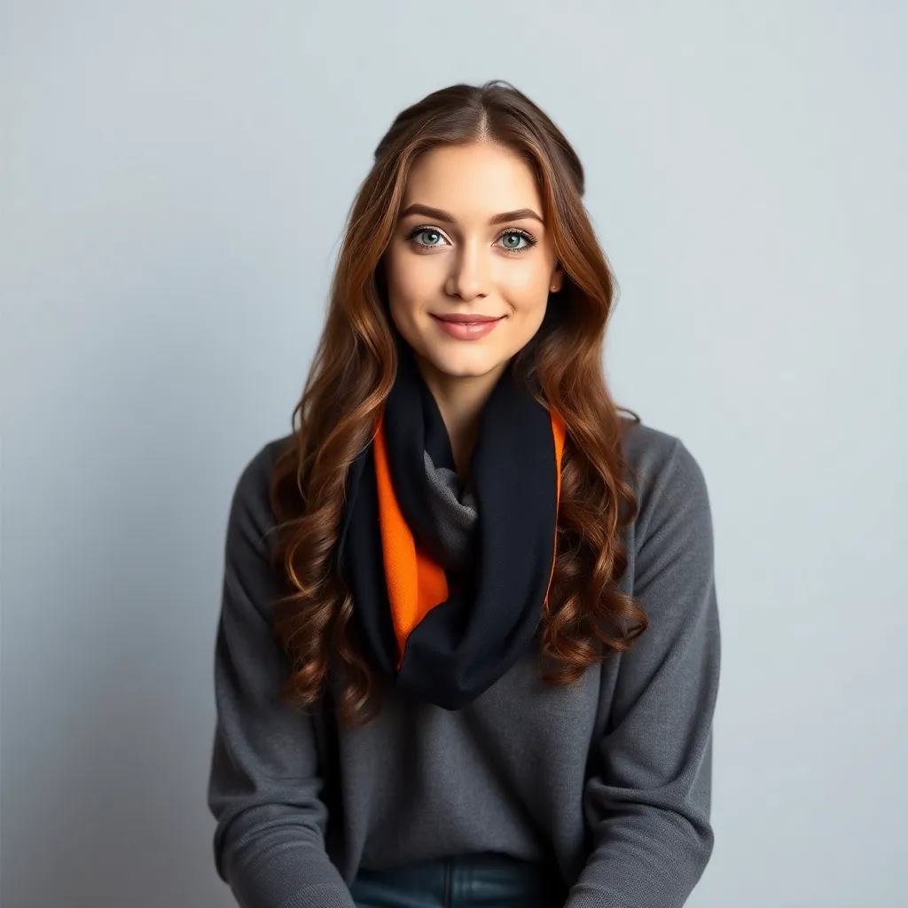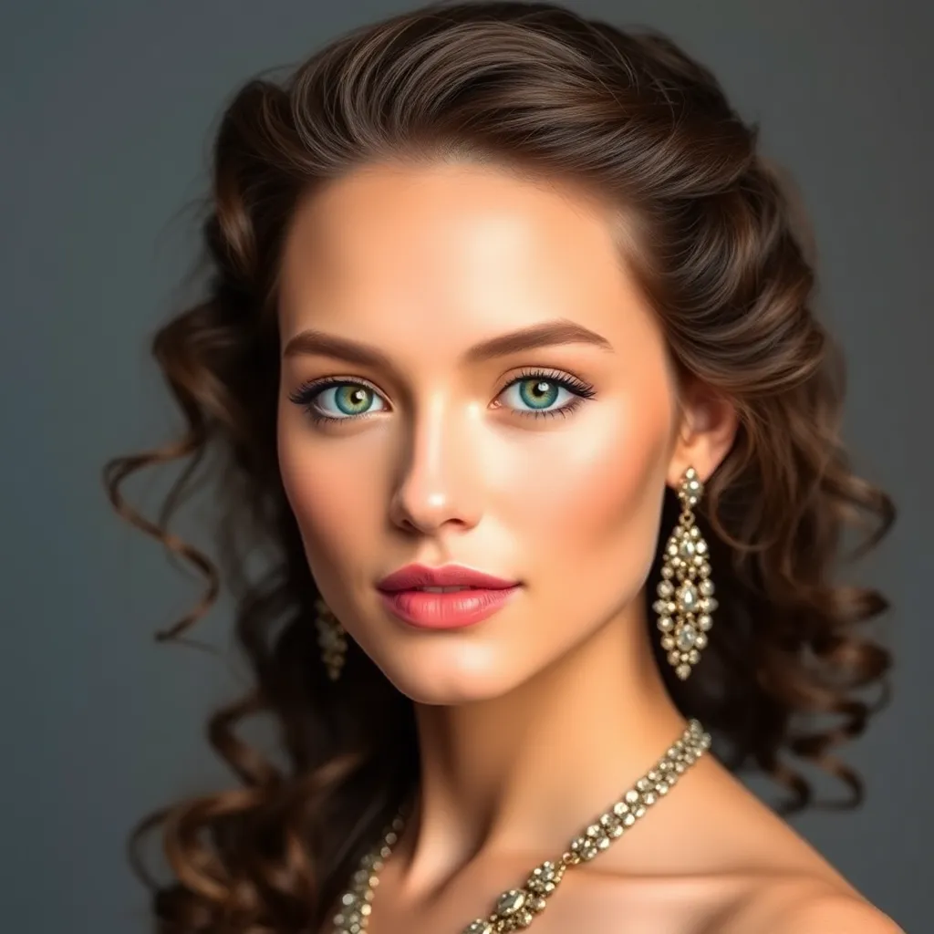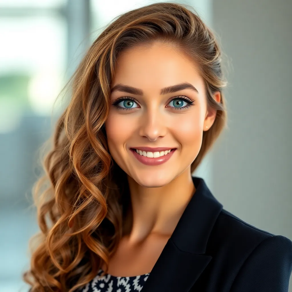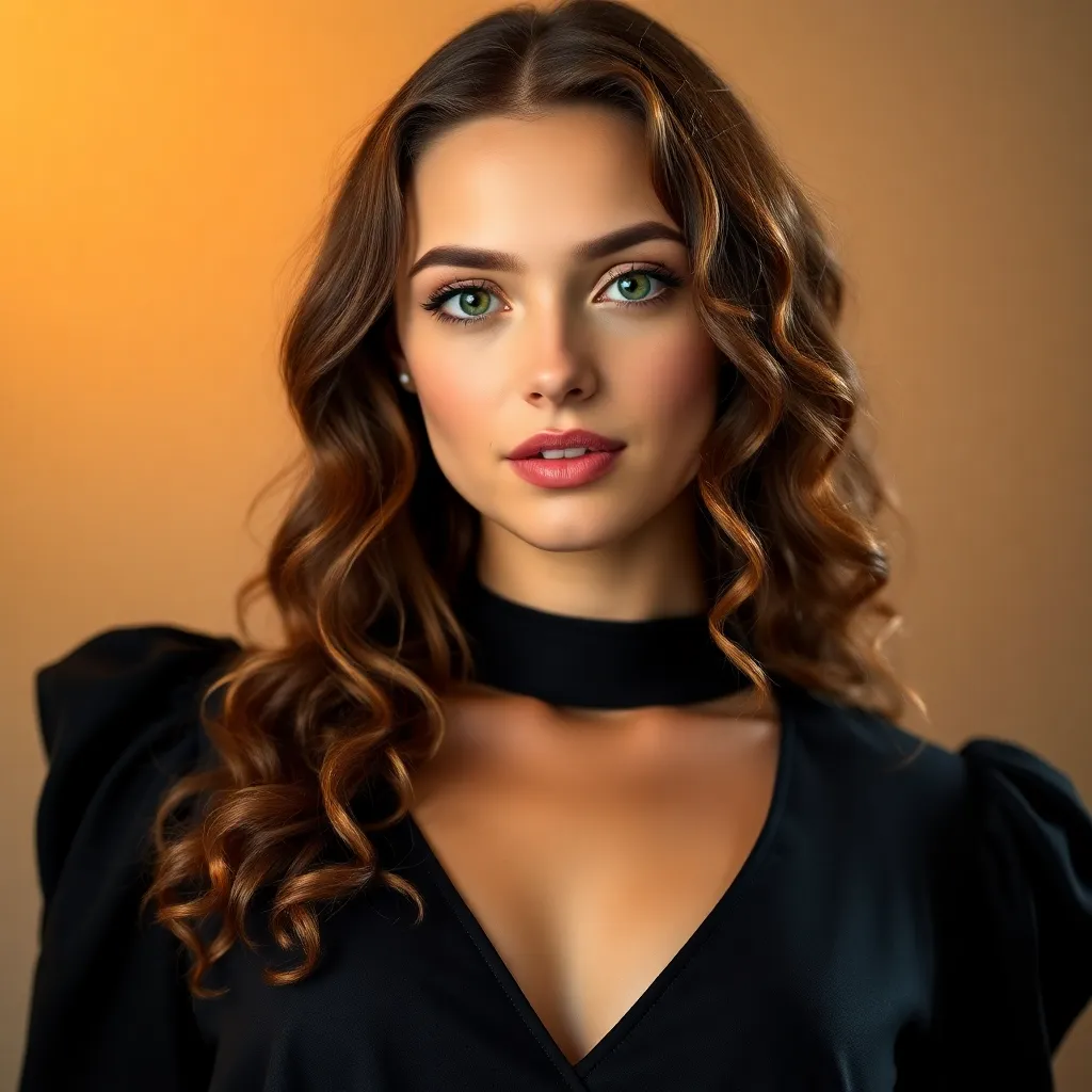 Create a stunning headshot of a confident and charismatic model. Imagine a 25-year-old woman with long, curly brown hair and bright green eyes. She's wearing a sleek black dress with a subtle sparkle and a statement silver necklace. Capture her radiant smile and captivating gaze in a sleek, modern setting.
