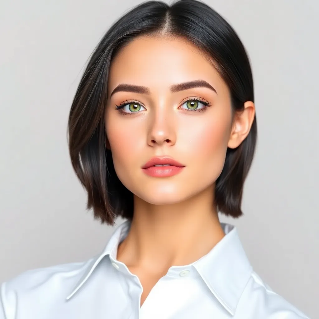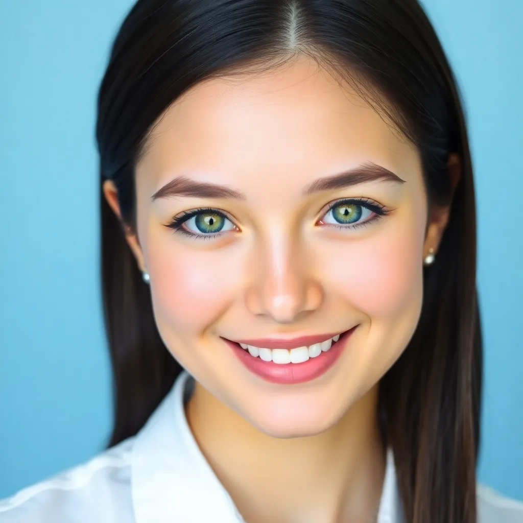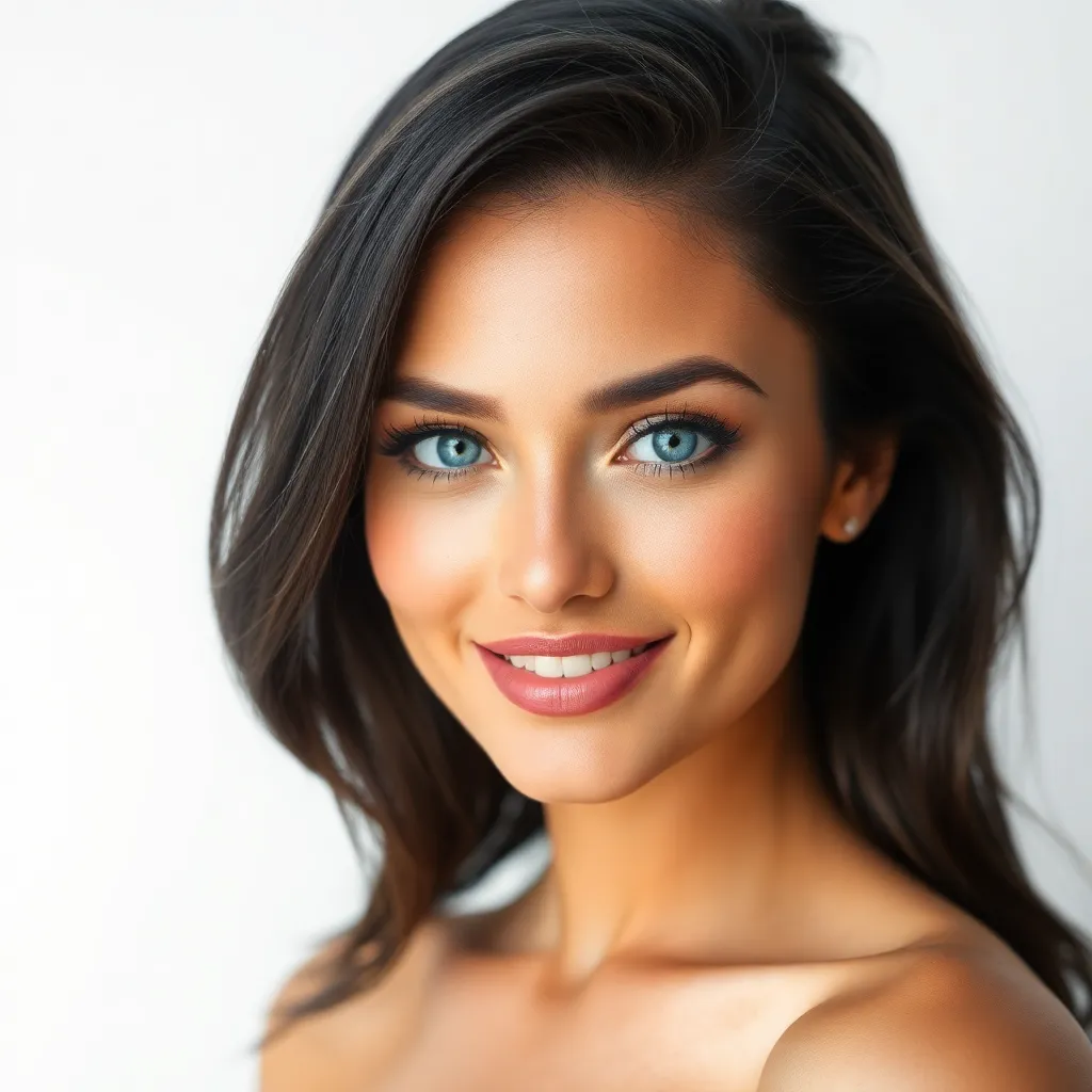 Create a stunning model headshot. Imagine a fashion-forward individual with piercing blue eyes, raven-black hair, and a radiant smile. Incorporate a subtle, modern makeup look and a sleek, high-fashion hairstyle. Use a clean, white or light-colored background to make the subject stand out. Capture the essence of glamour and sophistication.