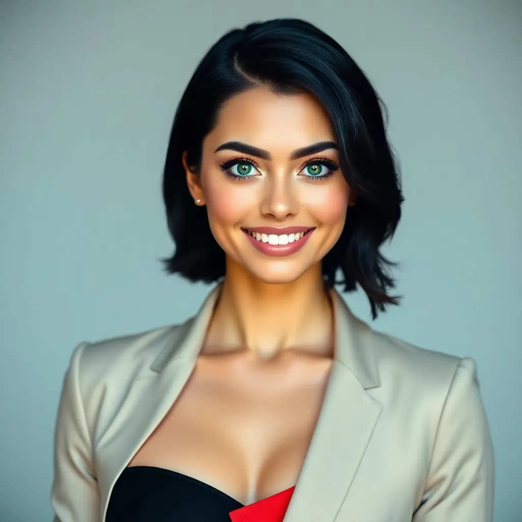 Create a stunning model headshot of a young woman with piercing green eyes, raven-black hair, and a bright, radiant smile. Her skin is smooth and luminous, with a subtle glow. She's dressed in a elegant white blouse with a soft, flowing neckline. Capture her confidence and charisma in a warm, golden light.