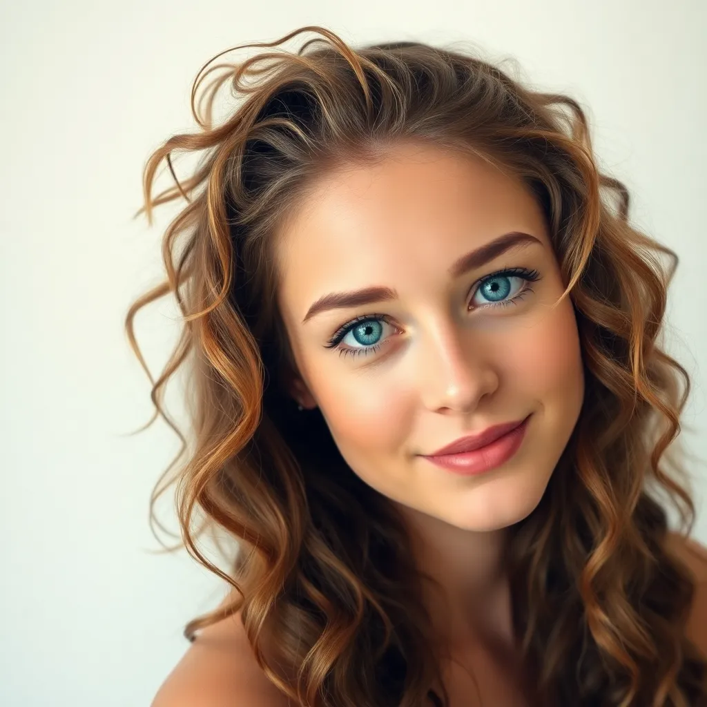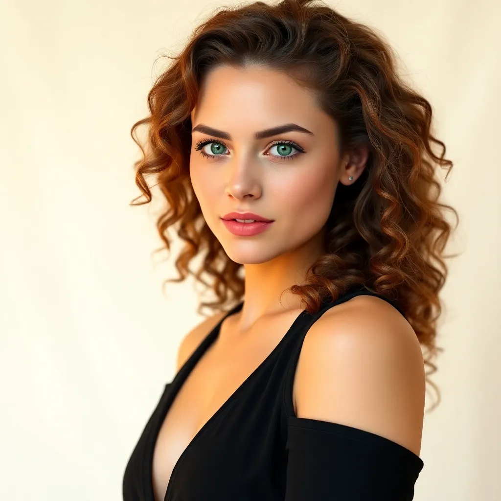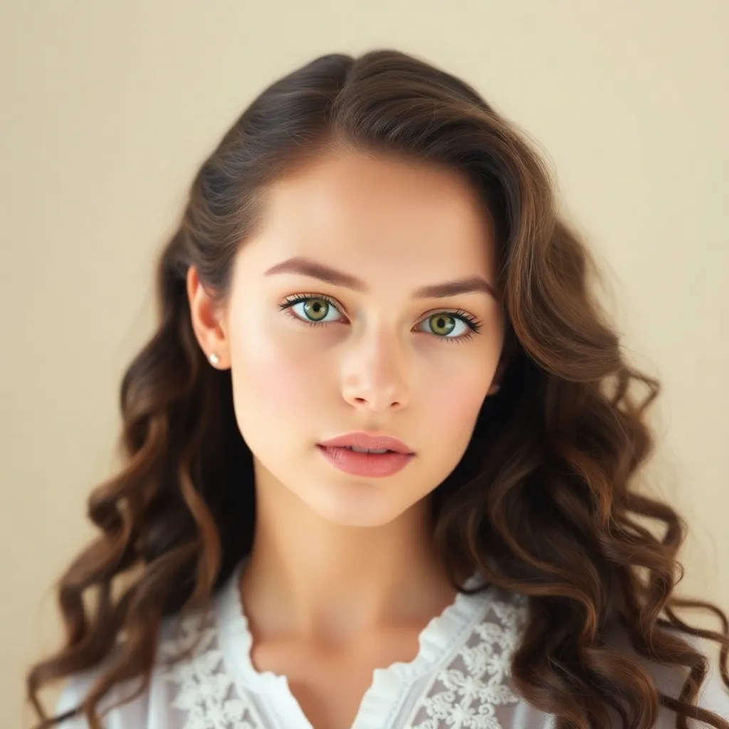 Create a stunning model headshot with a striking expression and captivating gaze. Imagine a young woman with long, curly brown hair and piercing green eyes, set against a soft, creamy background. She's wearing a elegant white blouse with a subtle pattern and a hint of makeup. The lighting is soft and flattering.