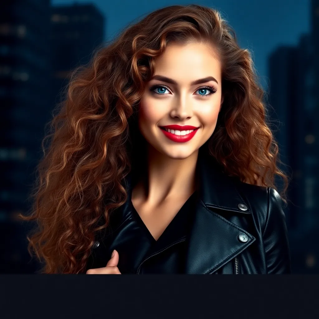 Create a stunning model headshot! Imagine a young woman with long, curly brown hair and bright blue eyes, dressed in a sleek black jumpsuit, sitting in a modern studio with a subtle cityscape background. Capture her confident and alluring expression, showcasing her perfect features and radiant smile.