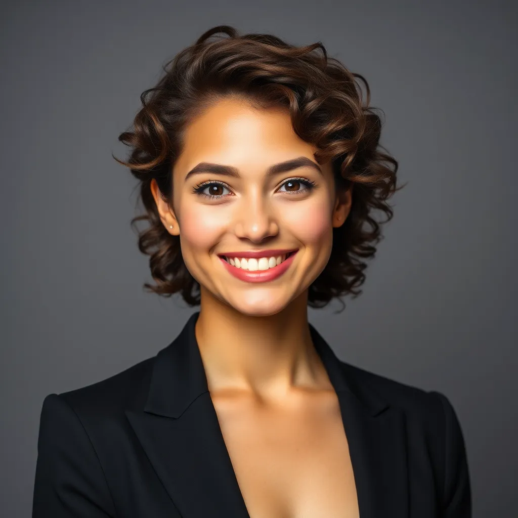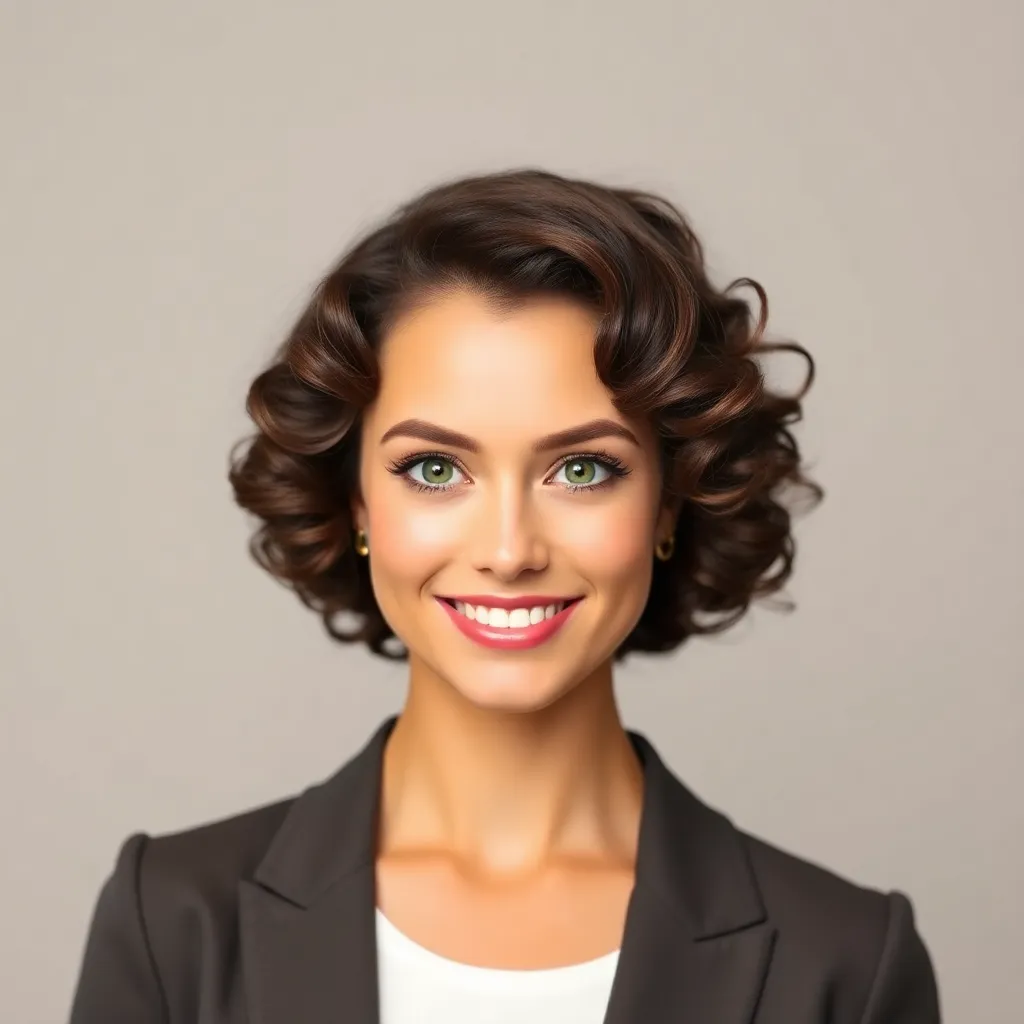 Create a professional model headshot for a fictional character, 'Lena', a 25-year-old aspiring actress. She has short, curly brown hair, bright green eyes, and a warm, radiant smile. Style her with a classic, elegant makeup look and a simple yet sophisticated outfit. The background should be a neutral tone.
